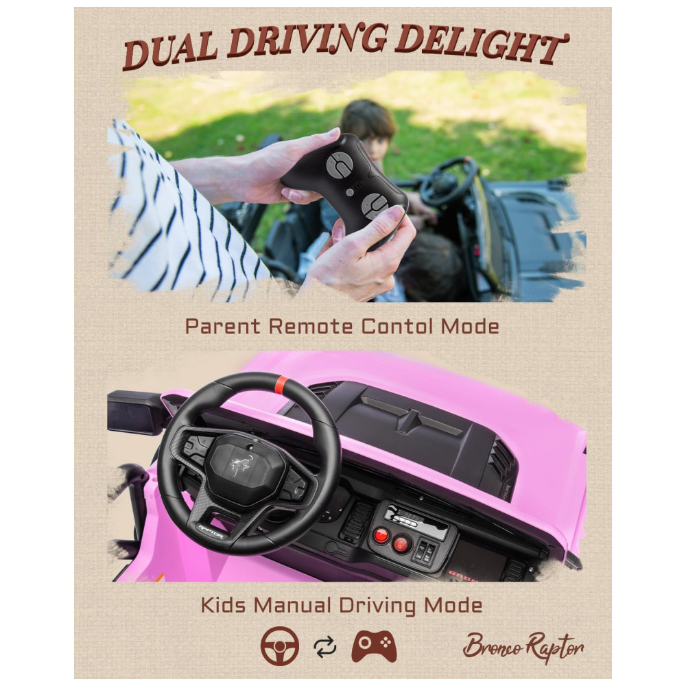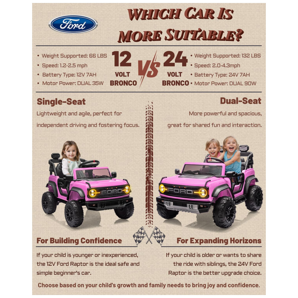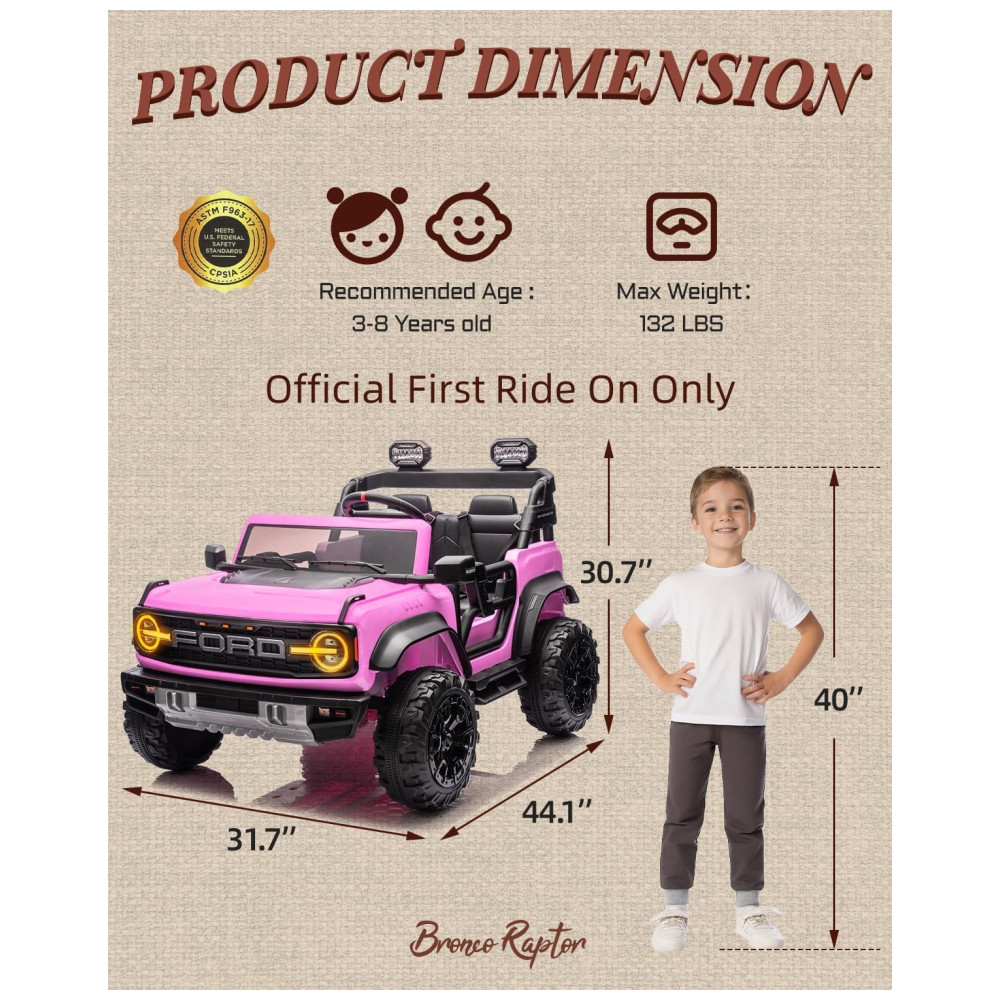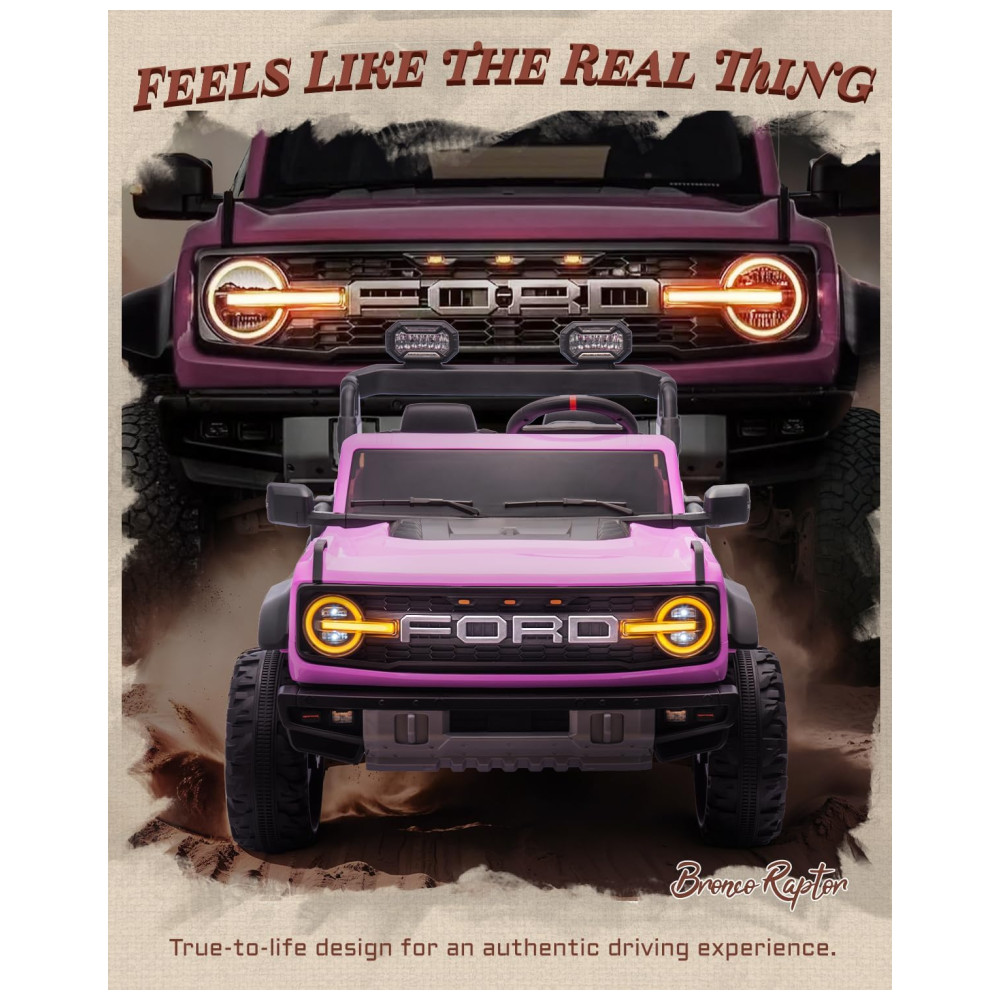 Carrinho Elétrico Infantil Ford Bronco Raptor 24V 2 Lugares Controle Remoto Suspensão 4×4 Luzes Led Bluetooth RosaFirst Ride On