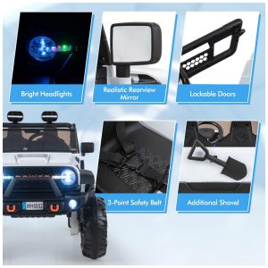 Possui assento duplo de 20″ (50 cm) com cintos de segurança de 3 pontos, adequado para até 2 crianças (3 a 8 anos) ou uma criança maior, respeitando o limite máximo de 50 kg. Inclui controle remoto (2,4Ghz) para supervisão parental, com 3 velocidades, função de frenagem instantânea e modo de controle total. O painel multimídia entrega som via MP3, USB, modo rádio, conexão auxiliar e botões interativos no volante (buzina e música).