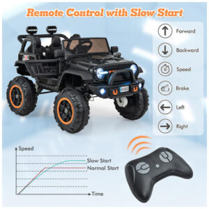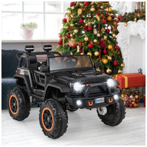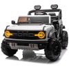 Sistema de suspensão em molas nas 4 rodas, pneus em polipropileno de alta densidade, funcionamento com marcha de avanço/recuo, portas abre-fecha com trava de segurança, faróis/luzes de LED e acabamento SUV robusto. Função partida suave evita trancos, ajuste manual 2WD/4WD, garantindo maior estabilidade e controle.