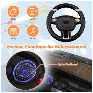 Possui assento duplo de 20″ (50 cm) com cintos de segurança de 3 pontos, adequado para até 2 crianças (3 a 8 anos) ou uma criança maior, respeitando o limite máximo de 50 kg. Inclui controle remoto (2,4Ghz) para supervisão parental, com 3 velocidades, função de frenagem instantânea e modo de controle total. O painel multimídia entrega som via MP3, USB, modo rádio, conexão auxiliar e botões interativos no volante (buzina e música).