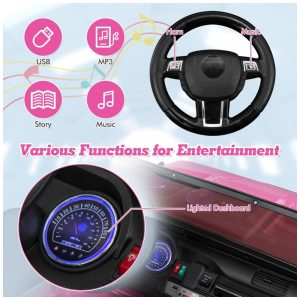 Possui assento duplo de 20″ (50 cm) com cintos de segurança de 3 pontos, adequado para até 2 crianças (3 a 8 anos) ou uma criança maior, respeitando o limite máximo de 50 kg. Inclui controle remoto (2,4Ghz) para supervisão parental, com 3 velocidades, função de frenagem instantânea e modo de controle total. O painel multimídia entrega som via MP3, USB, modo rádio, conexão auxiliar e botões interativos no volante (buzina e música).