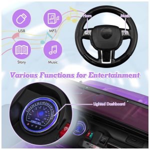 Possui assento duplo de 20″ (50 cm) com cintos de segurança de 3 pontos, adequado para até 2 crianças (3 a 8 anos) ou uma criança maior, respeitando o limite máximo de 50 kg. Inclui controle remoto (2,4Ghz) para supervisão parental, com 3 velocidades, função de frenagem instantânea e modo de controle total. O painel multimídia entrega som via MP3, USB, modo rádio, conexão auxiliar e botões interativos no volante (buzina e música).