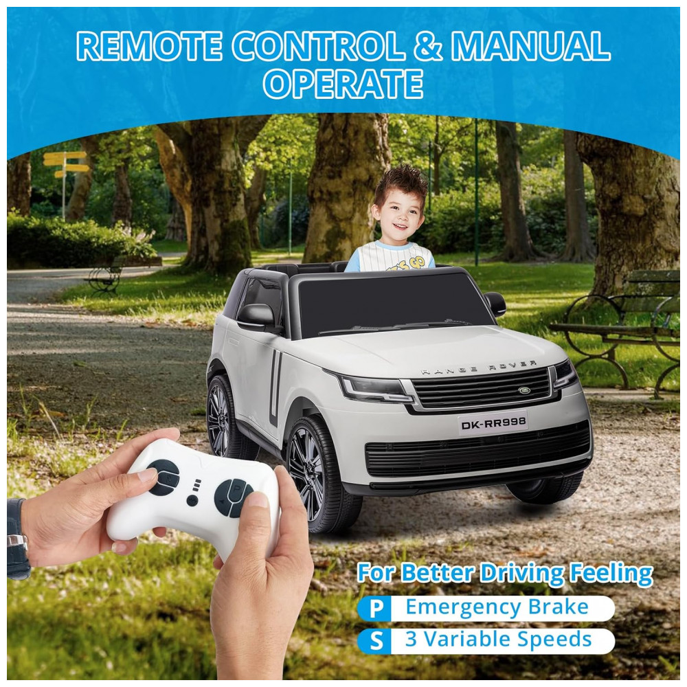 O Carrinho Elétrico Infantil Land Rover 24V licenciado Hetoy oferece alta potência e detalhes realistas SUV para crianças de 3 a 8 anos. Equipado com dois motores de 240W (total 480W) alimentados por bateria de 24V 7Ah, proporciona velocidade máxima de 8 km/h, autonomia de até 2 horas e desempenho seguro em múltiplos terrenos (grama, calçada, terra). O sistema de controle remoto parental 2.4GHz possui três velocidades ajustáveis, além de operação manual via pedal e volante.
