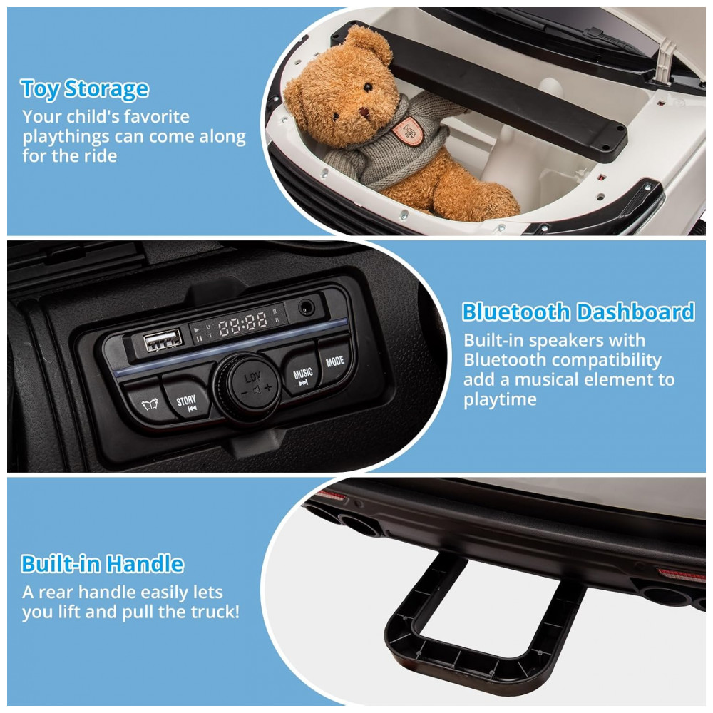 O painel multimídia permite reprodução via MP3, Bluetooth, USB e possui sons realistas de motor, buzina, luzes LED, fácil comando de marcha e partida por botão. Assento duplo espaçoso com cintos de segurança, suspensão independente por molas nas quatro rodas, portas laterais com travas, compartimento frontal para armazenamento e estrutura reforçada em PP e ferro garantem máxima proteção.