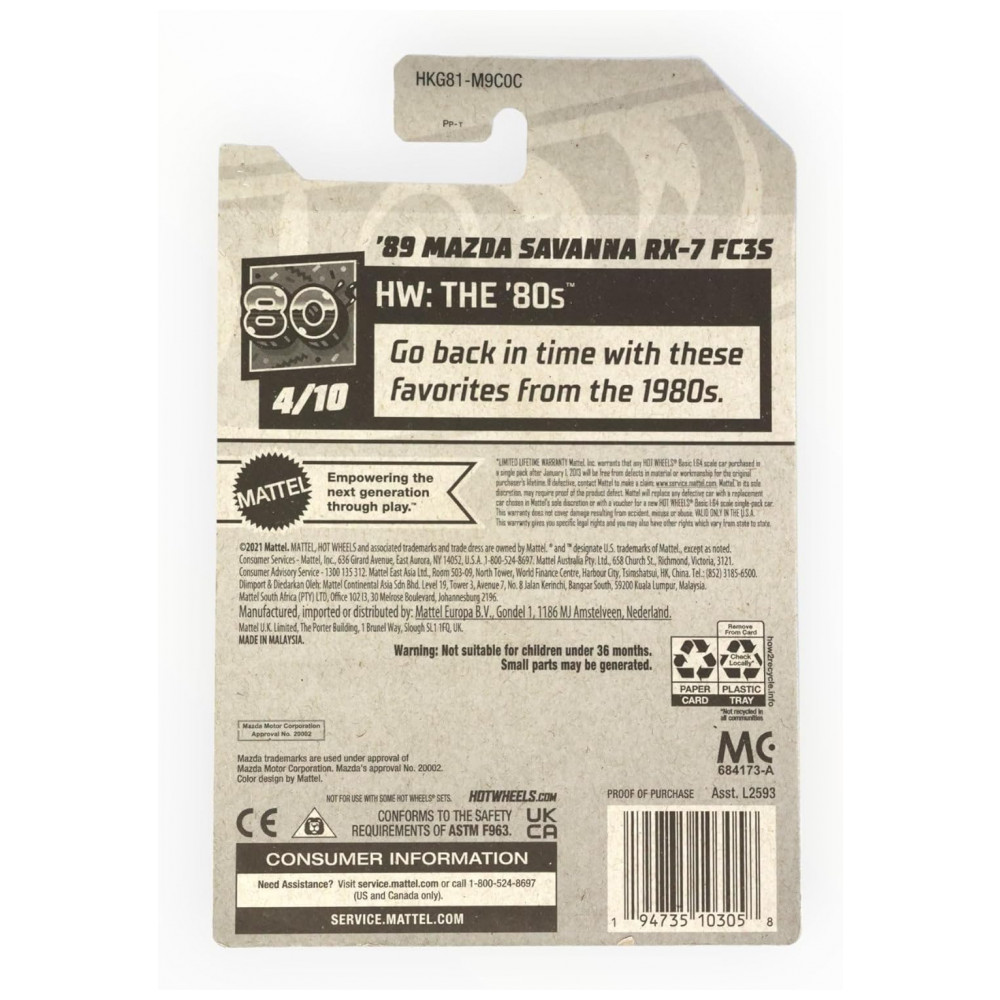 Encante-se com o incrível carrinho de coleção da marca Hot Wheels! O modelo 89 Mazda Savanna RX7 FC3S na cor verde é feito em metal fundido escala 1:64 e peso de 100 gramas. Um item perfeito para colecionadores e amantes de carros miniaturas. Este modelo autêntico e detalhado é ideal para crianças a partir de 36 meses até 5 anos. Não perca a oportunidade de adicionar essa preciosidade à sua coleção!