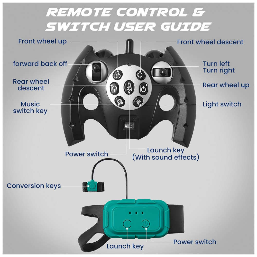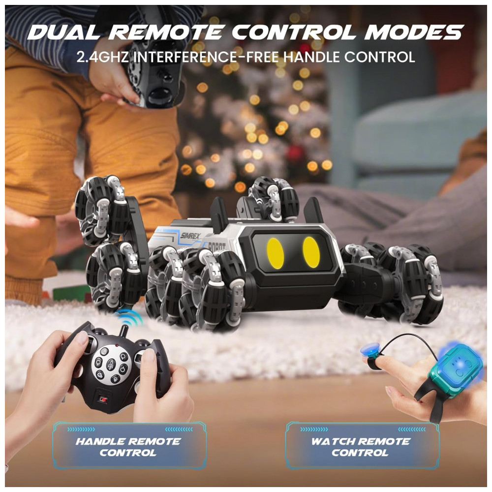 O modelo oferece dois sistemas de controle: controle remoto 2,4GHz para movimentação precisa e pulseira de detecção de gestos para operação por movimentos da mão. O sistema sem fio proporciona controle estável em distâncias típicas de brinquedos de rádio controle, com resposta rápida a comandos de aceleração, frenagem, mudanças de direção e acrobacias. Há oito modos de ação com sequências pré-programadas, que incluem mudanças de postura, deslocamentos rápidos e giros combinados com efeitos sonoros.