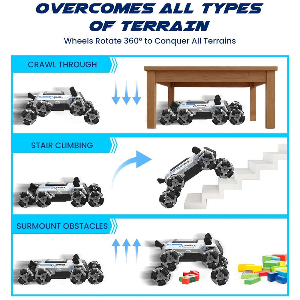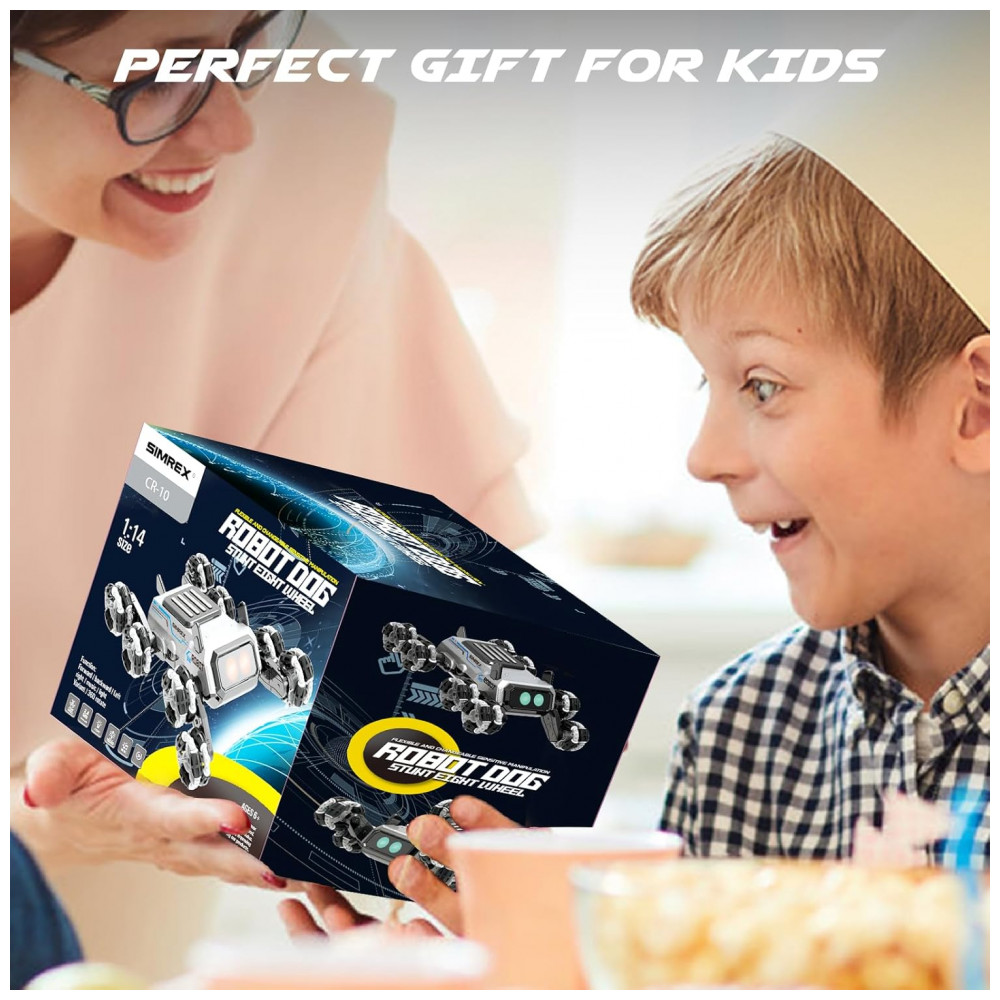 O carrinho robô em formato de cachorro SIMREX TOY2502 utiliza oito rodas com sistema mecanum, permitindo deslocamentos em 360 graus, como movimentos laterais, giros rápidos e manobras de acrobacia em pisos internos. Os olhos em LED RGB alternam cores automaticamente, compondo um visual de robô futurista durante o uso. O brinquedo é indicado para crianças a partir de 3 anos, atendendo uma faixa de idade ampla até a adolescência.