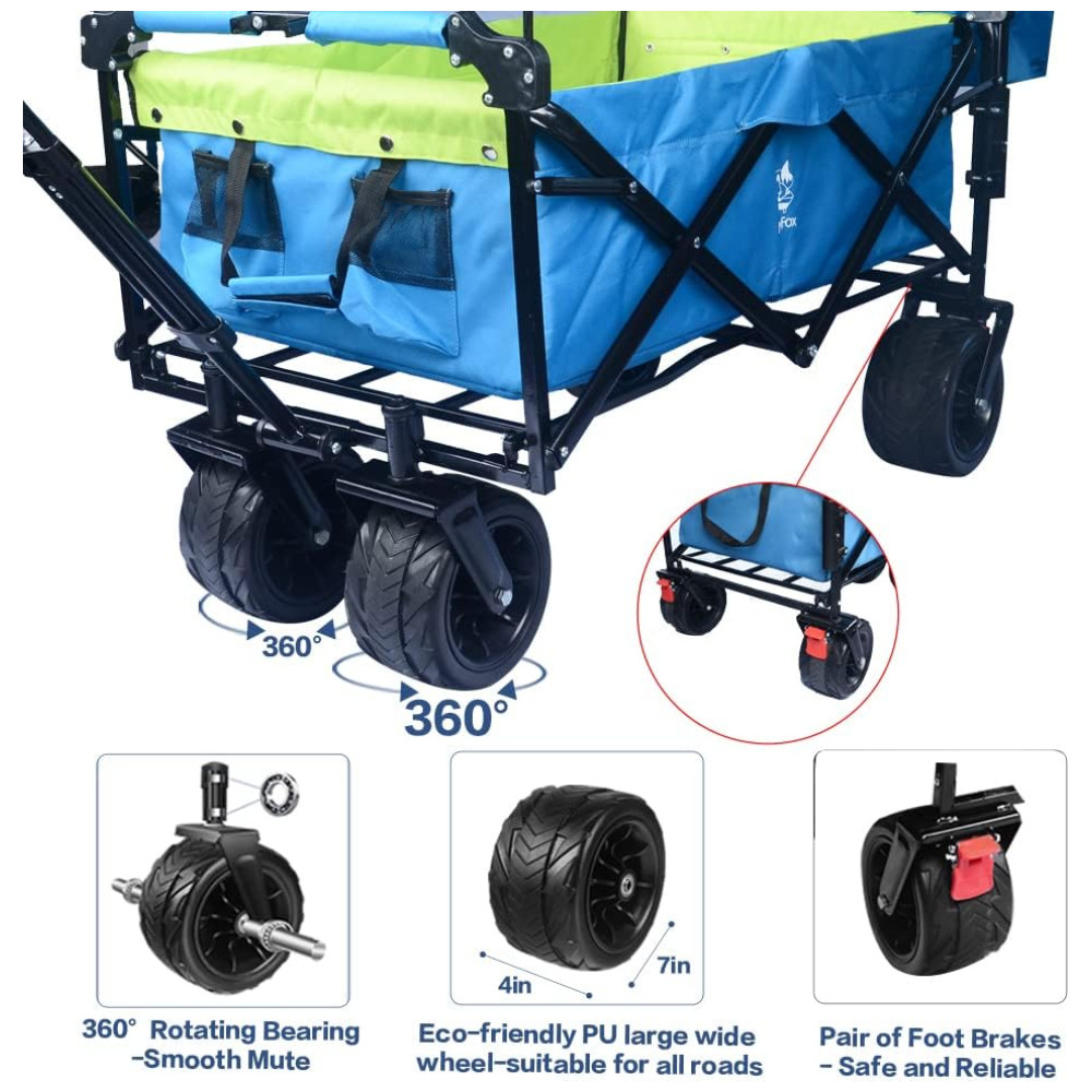 As rodas grandes giratórias de 360 graus, com tamanho de 17 cm de diâmetro x 12 cm de largura, podem ser amplamente utilizadas em diferentes tipos de terrenos, como areia de praia, rampas, pedras, gramados e degraus. O carrinho possui um par de freios de pé nas rodas traseiras e pode ser facilmente aberto para uma grande capacidade de armazenamento interno de aproximadamente 100 litros, sem necessidade de montagem, configurado em 3 segundos para dobrar ou abrir.