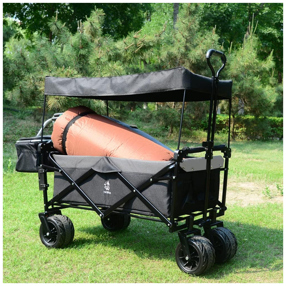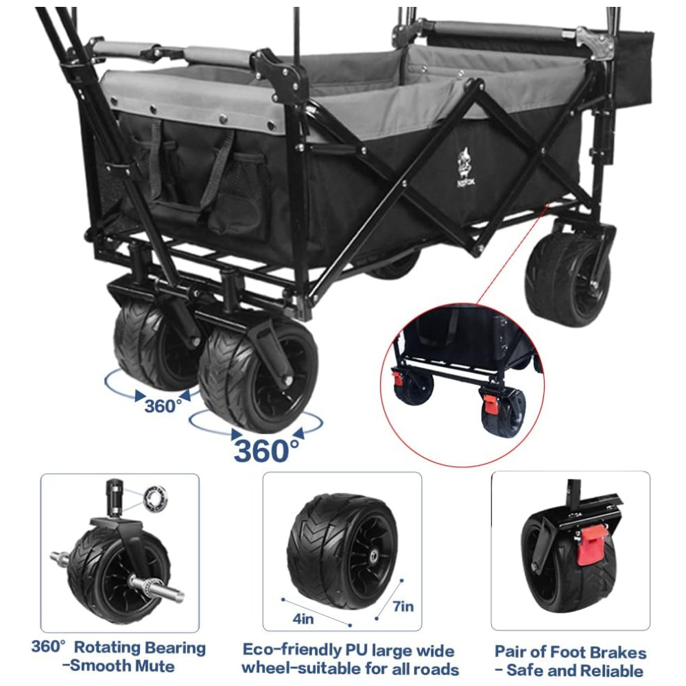 As rodas grandes giratórias de 360 graus, com tamanho de 17 cm de diâmetro x 12 cm de largura, podem ser amplamente utilizadas em diferentes tipos de terrenos, como areia de praia, rampas, pedras, gramados e degraus. O carrinho possui um par de freios de pé nas rodas traseiras e pode ser facilmente aberto para uma grande capacidade de armazenamento interno de aproximadamente 100 litros, sem necessidade de montagem, configurado em 3 segundos para dobrar ou abrir.