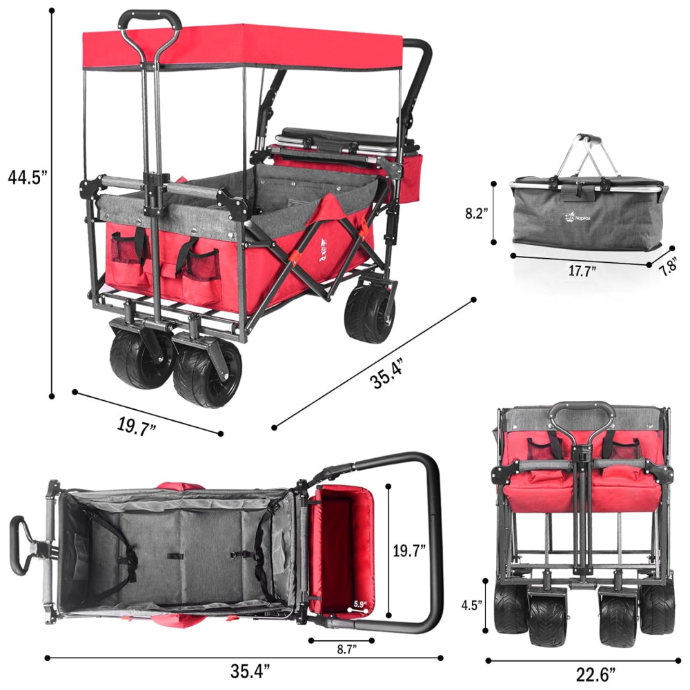 Quando dobrado, o carrinho tem um tamanho de aproximadamente 76 x 61 x 20 cm e um peso de aproximadamente 15,74 quilos. A alça telescópica é ajustável e pode ser estendida até 101 cm, proporcionando uma alça ajustável de 180 graus, permitindo que você empurre ou puxe o carrinho com facilidade. O carrinho também possui um cesto traseiro de 50 x 16 x 22 cm, uma bolsa térmica portátil à prova de vazamentos que mantém o frio por até 34 horas, muitos bolsos internos de armazenamento, um par de tiras de segurança de três pontos e um dossel removível que oferece proteção solar e à prova de chuva.