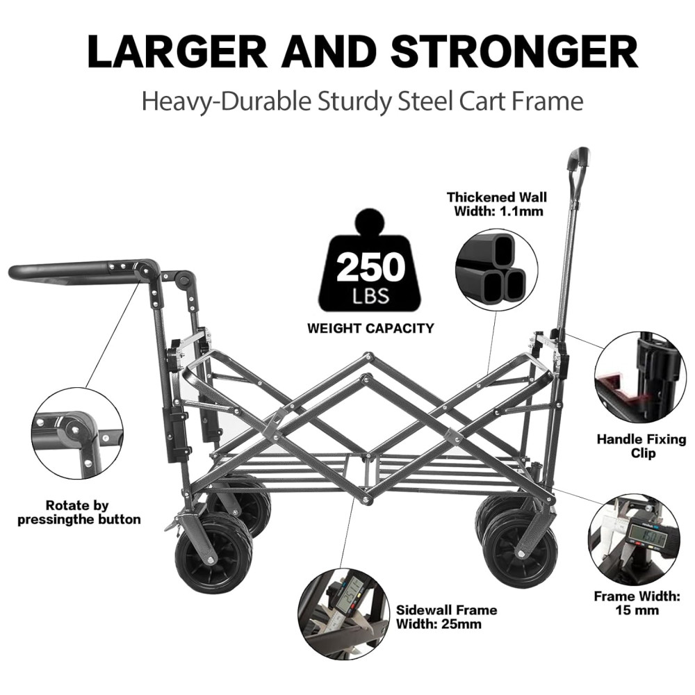 As rodas grandes giratórias de 360 graus, com tamanho de 17 cm de diâmetro x 12 cm de largura, podem ser amplamente utilizadas em diferentes tipos de terrenos, como areia de praia, rampas, pedras, gramados e degraus. O carrinho possui um par de freios de pé nas rodas traseiras e pode ser facilmente aberto para uma grande capacidade de armazenamento interno de aproximadamente 100 litros, sem necessidade de montagem, configurado em 3 segundos para dobrar ou abrir.
