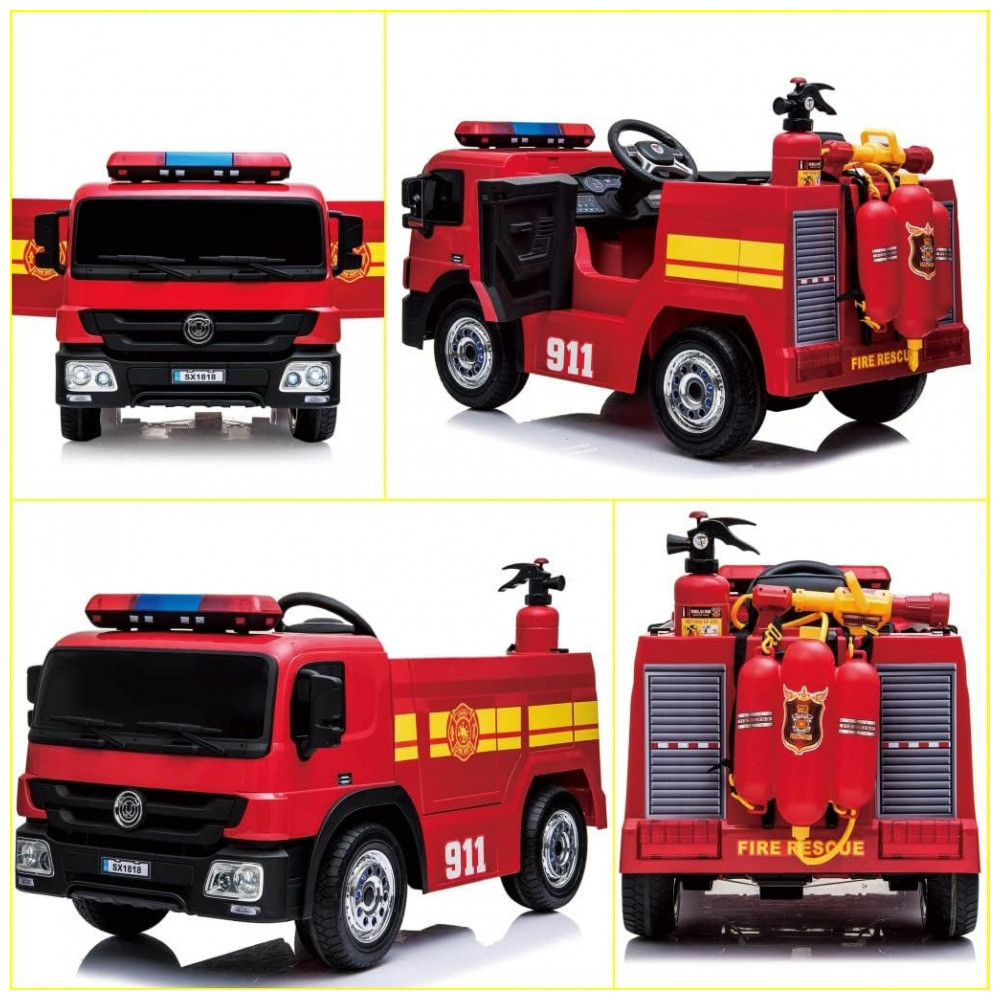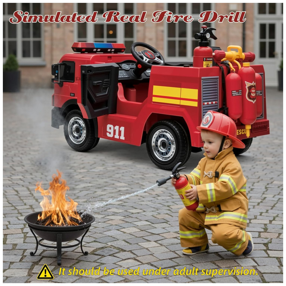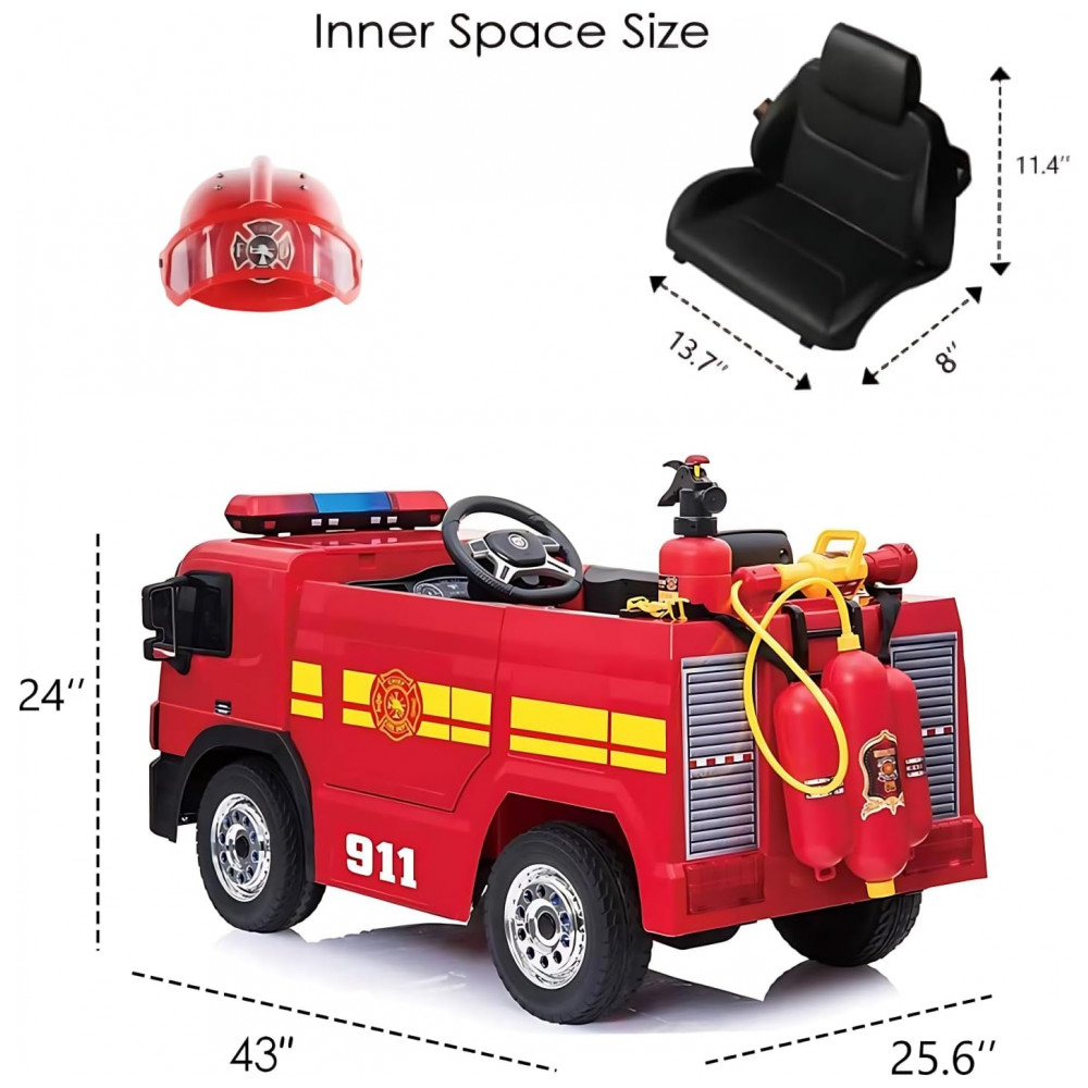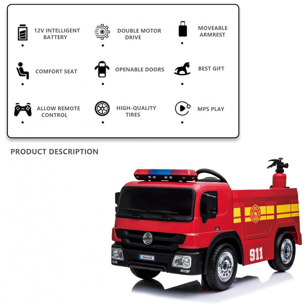 PROJETO MULTIFUNCIONAL Passeio em caminhão de bombeiros, extintor de incêndio simulado, canhão de água e capacete, sirenes realistas, cinto de segurança, portas abertas, pedais elétricos, 5 faróis de LED, entrada e reprodução de MP3. Uma variedade de recursos pode proporcionar ao seu filho uma experiência de condução de caminhão de bombeiros quase real e satisfazer a experiência de bombeiro de vestir o seu filho.