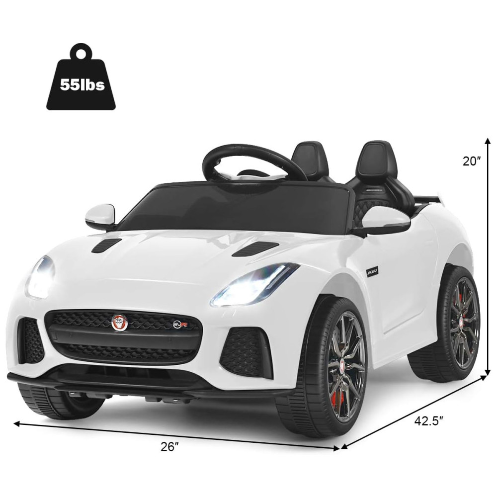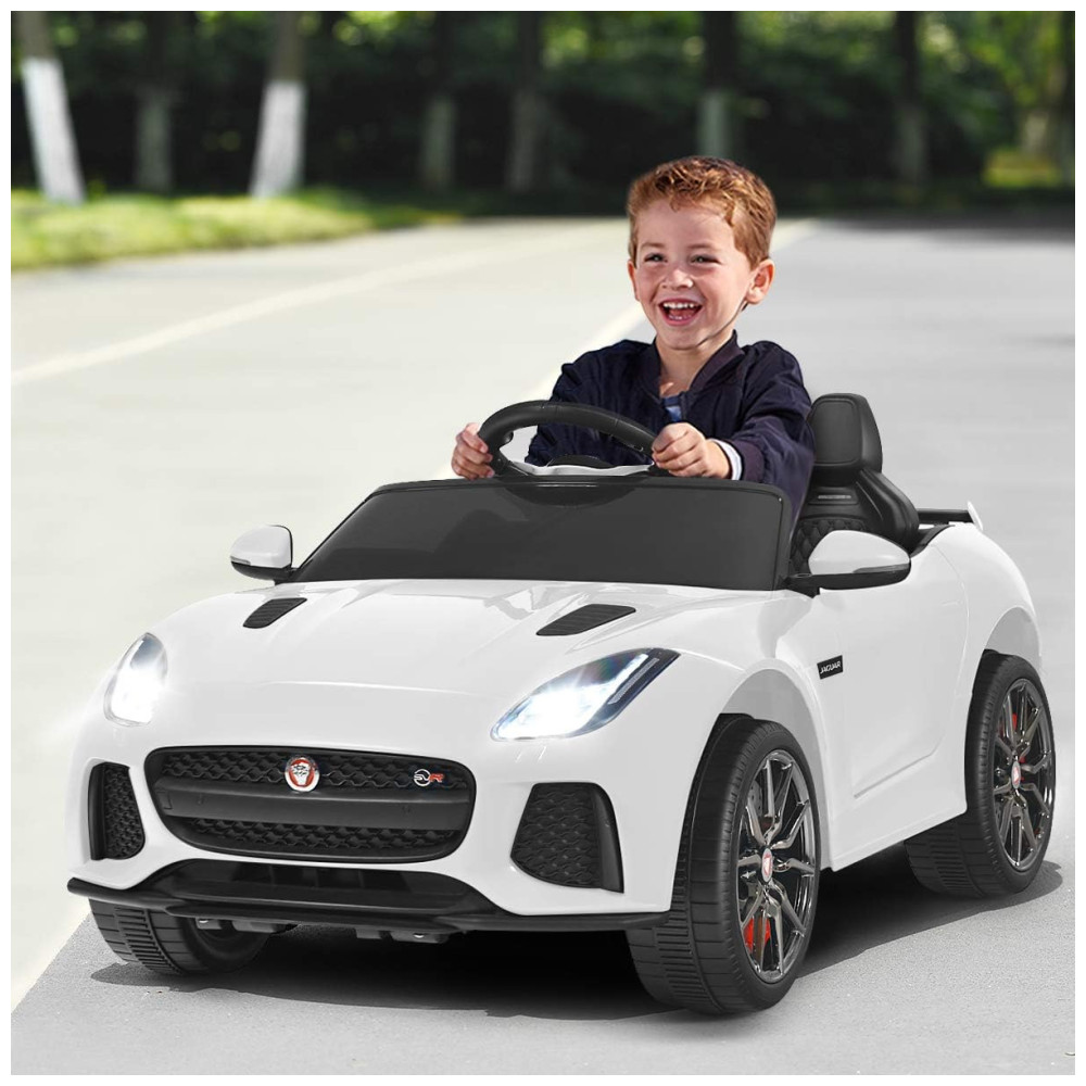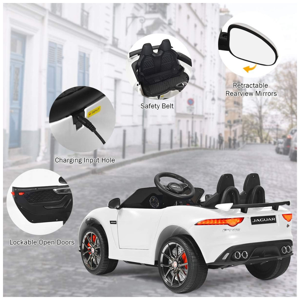 Passeio no carro licenciado legal Este passeio no carro Jaguar F type oficialmente licenciado tem uma aparência legal e elegante, juntamente com faróis e buzinas. Apresentando tubos de escape duplos e espelhos, ele imita muito o carro real. Além disso, o design de abertura de porta dupla torna mais fácil para os bebês entrar e sair sem problemas.