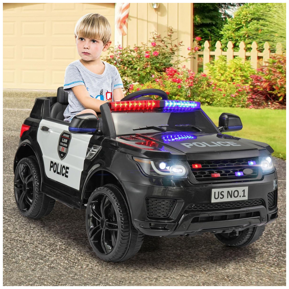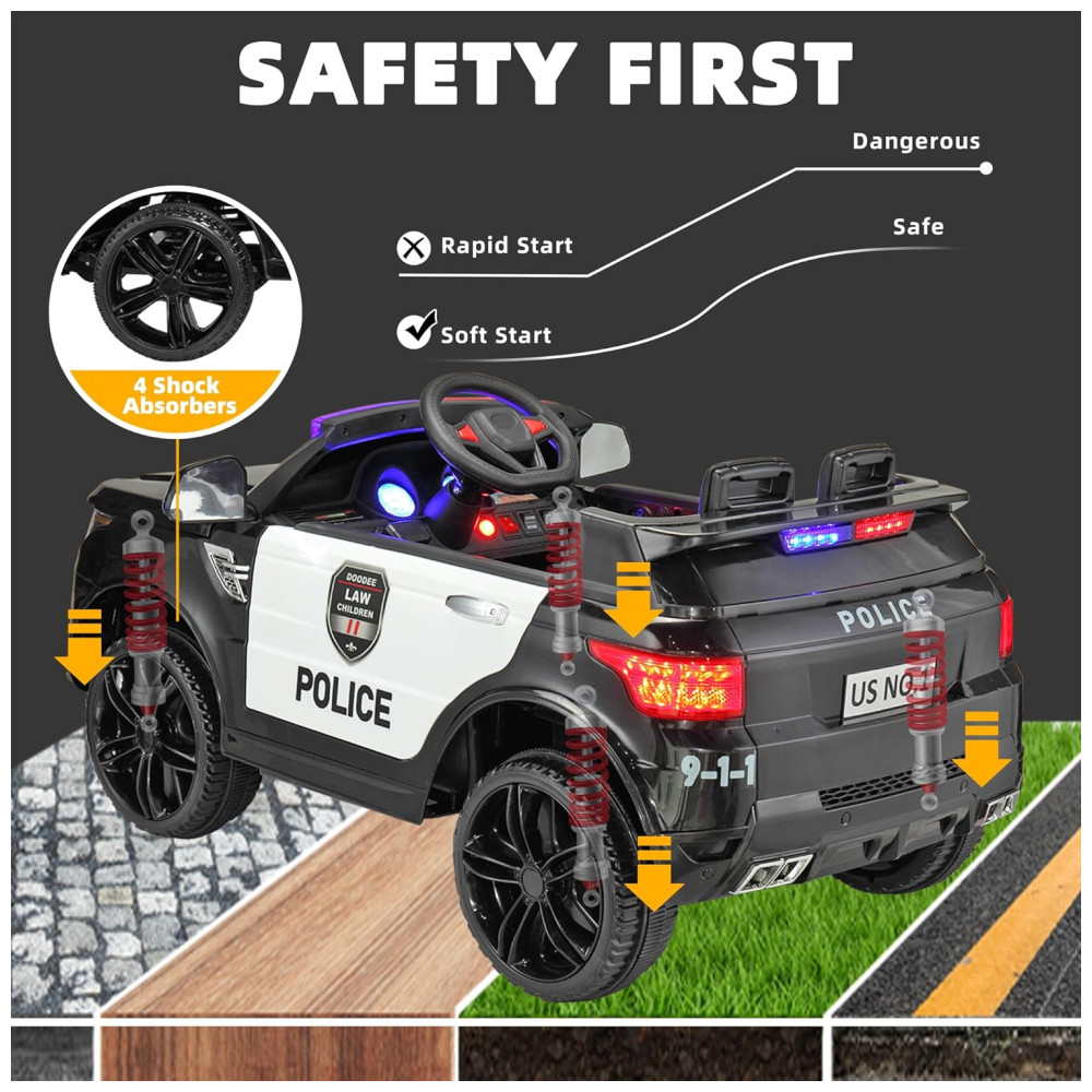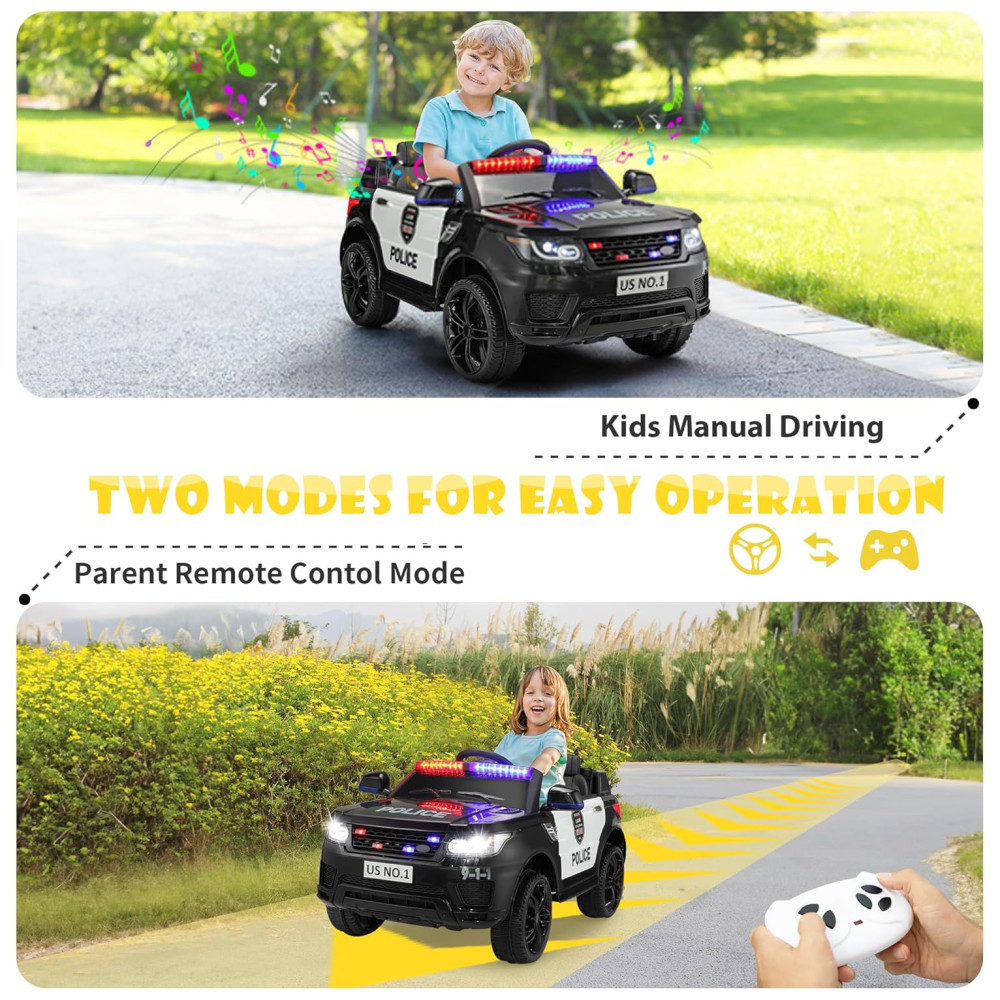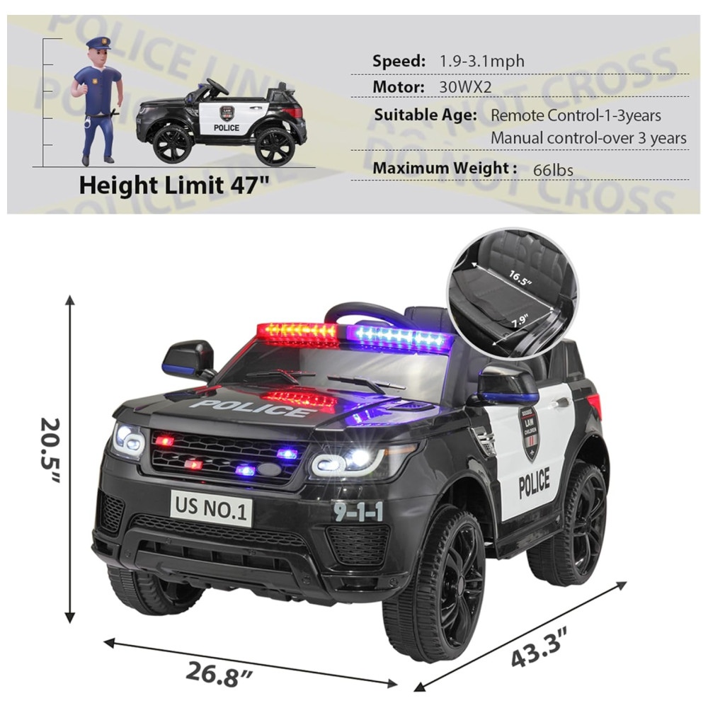 Carro Carrinho Elétrico Policial 2 lugares à bateria 12V USB controle remoto Vel 5km por hora idade 3 a 6 anos TOBBI Preto
