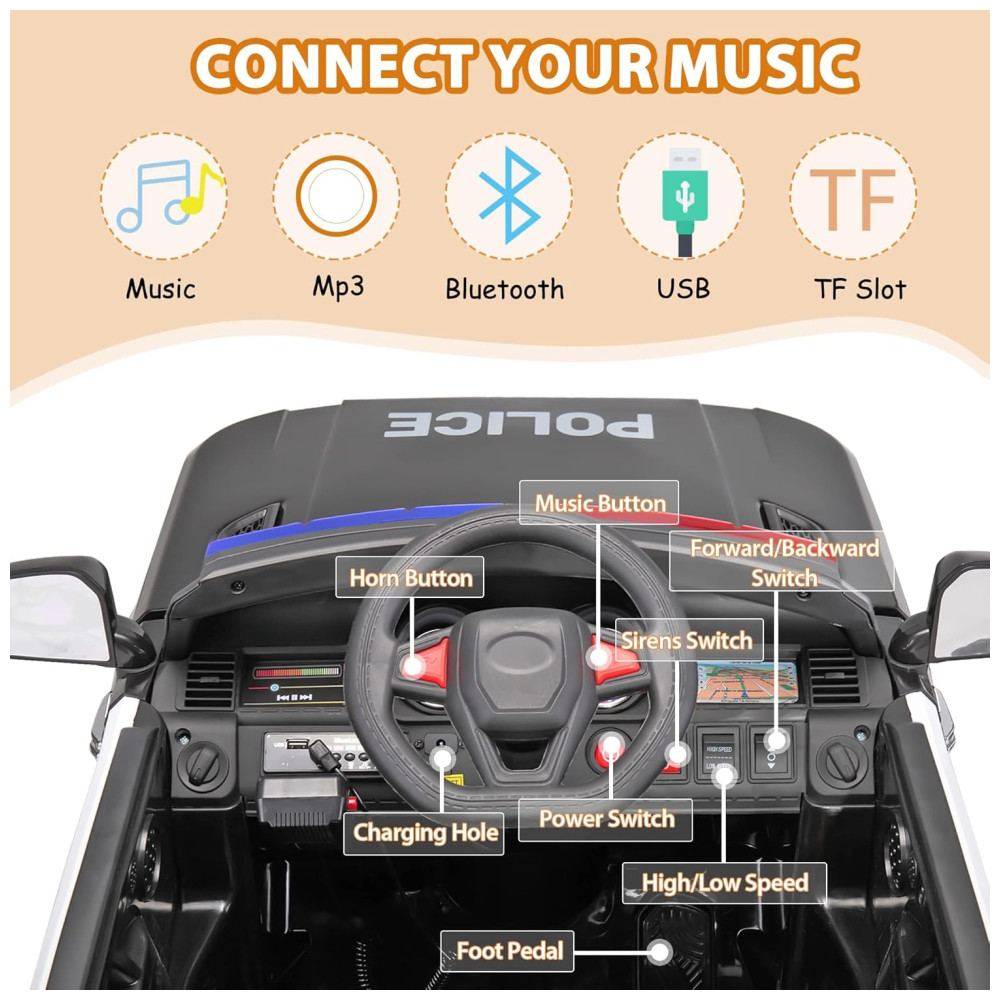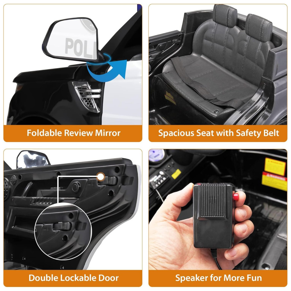 FUNÇÕES MÚLTIPLAS Passeio em carro policial, megafone real, luzes e faróis policiais de trabalho, buzina, espelho retrovisor, entrada e reproduções de MP3, interruptor de alta , média , baixa velocidade, com portas que podem abrir e fechar. Dando ao seu filho uma experiência quase real de dirigir um carro de polícia.