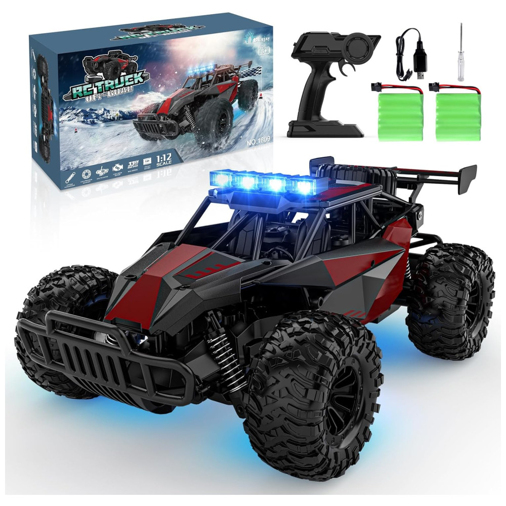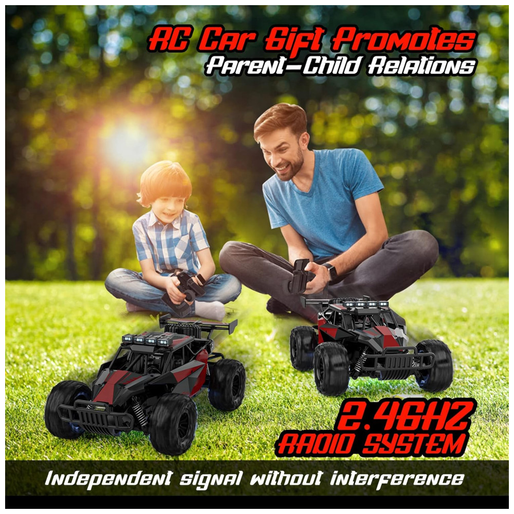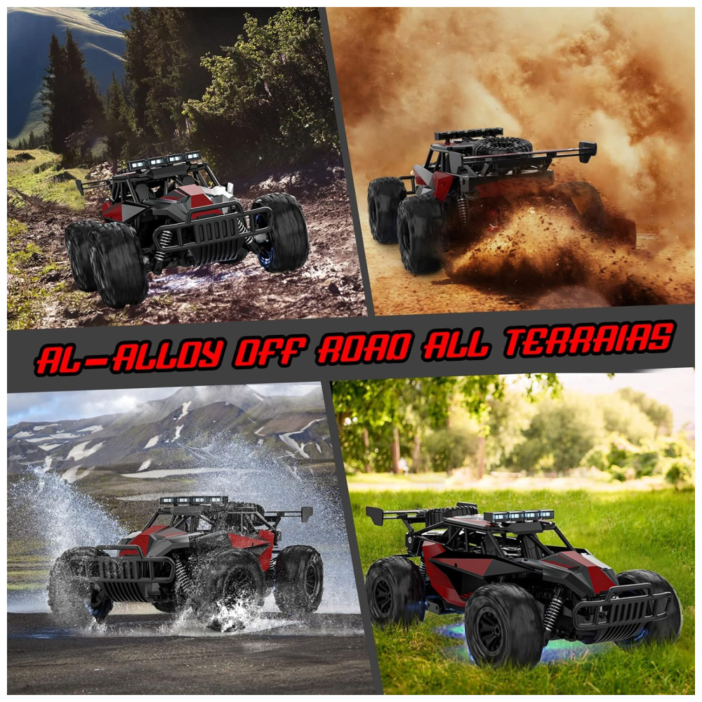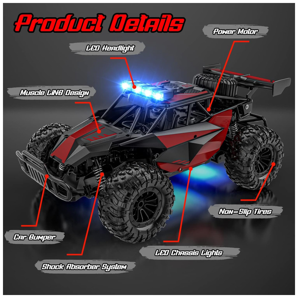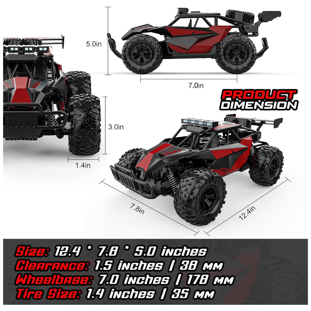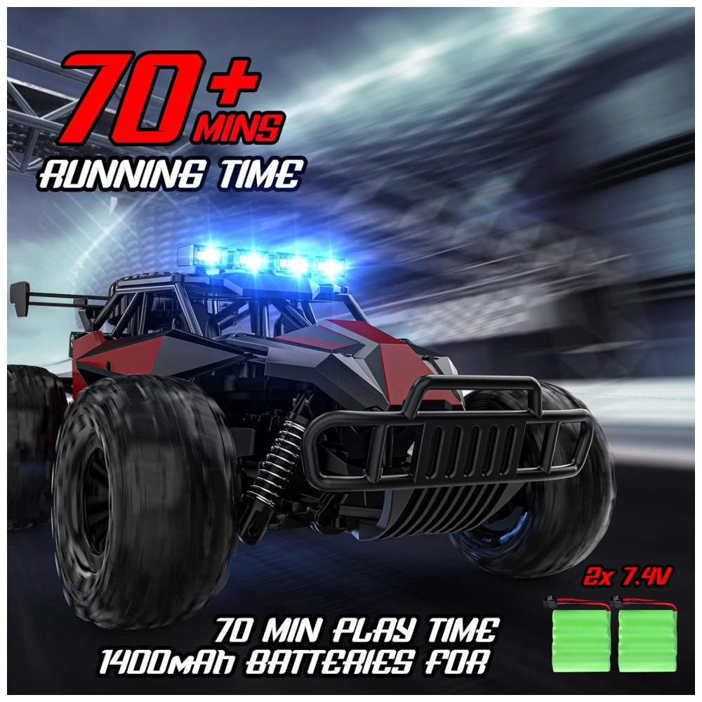 O carro é alimentado por um motor RC 380 potente, permitindo atingir velocidades de até 33 km/h. Com controle remoto de 2,4 GHz, sem atrasos, e uma distância de controle de 50 metros, este caminhão monstro off-road é perfeito para corridas emocionantes. A estrutura do carro é durável, com chassi ABS e corpo principal feito de liga de alumínio, proporcionando maior resistência ao impacto e menos peso. O farol de LED ilumina a estrada à frente durante a noite. A bateria recarregável de íon de lítio de 7,4V 1400mAh permite que o carro funcione por até 70 minutos por vez, com 2 baterias incluídas. Este carro RC é um ótimo presente para aniversários e outras ocasiões, proporcionando horas de diversão em família.