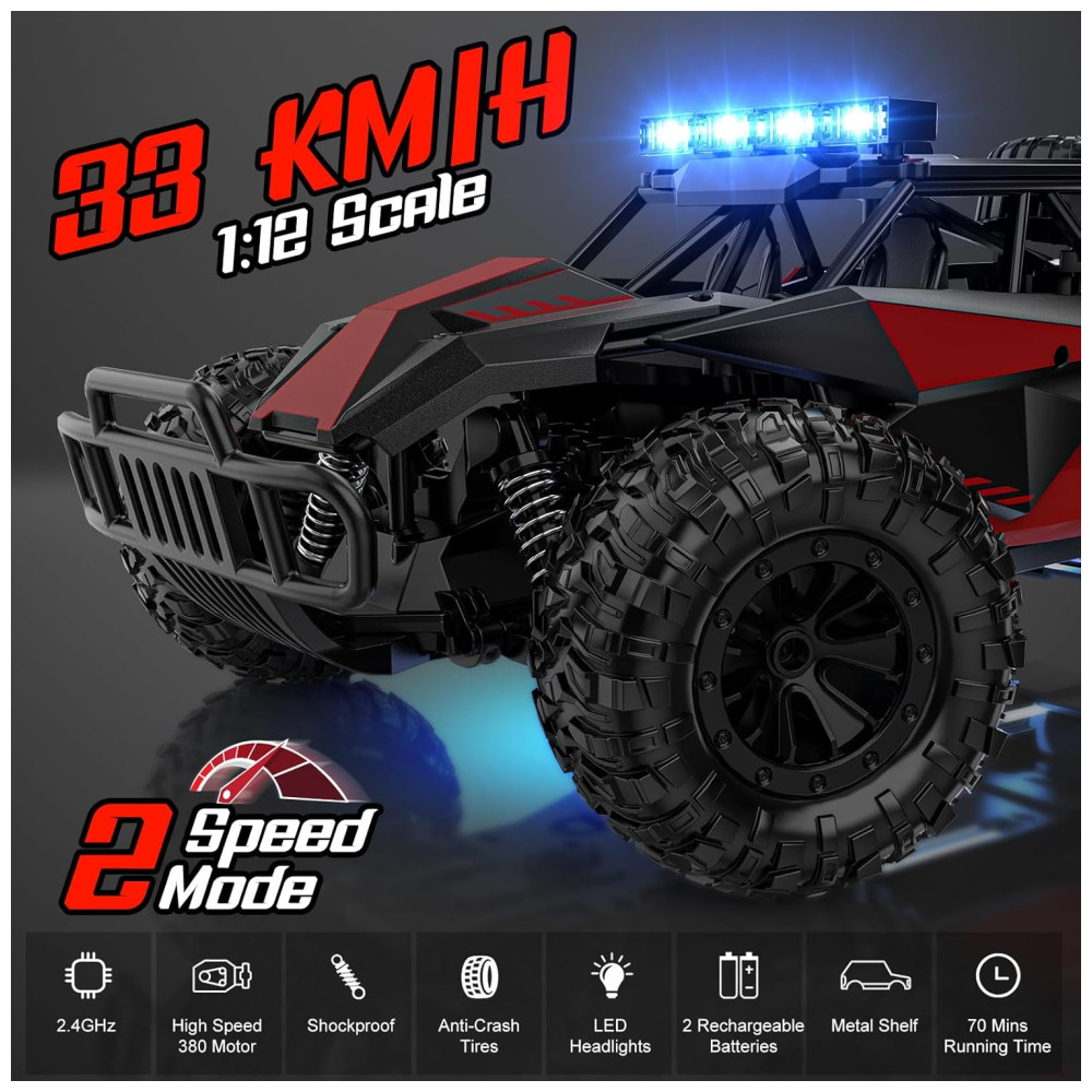 Carro de Controle Remoto 2.4GHz Alta Velocidade 33 KM/H Off Road Escala 1:12 Bluejay Vermelho e Preto