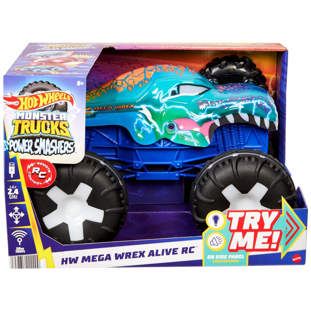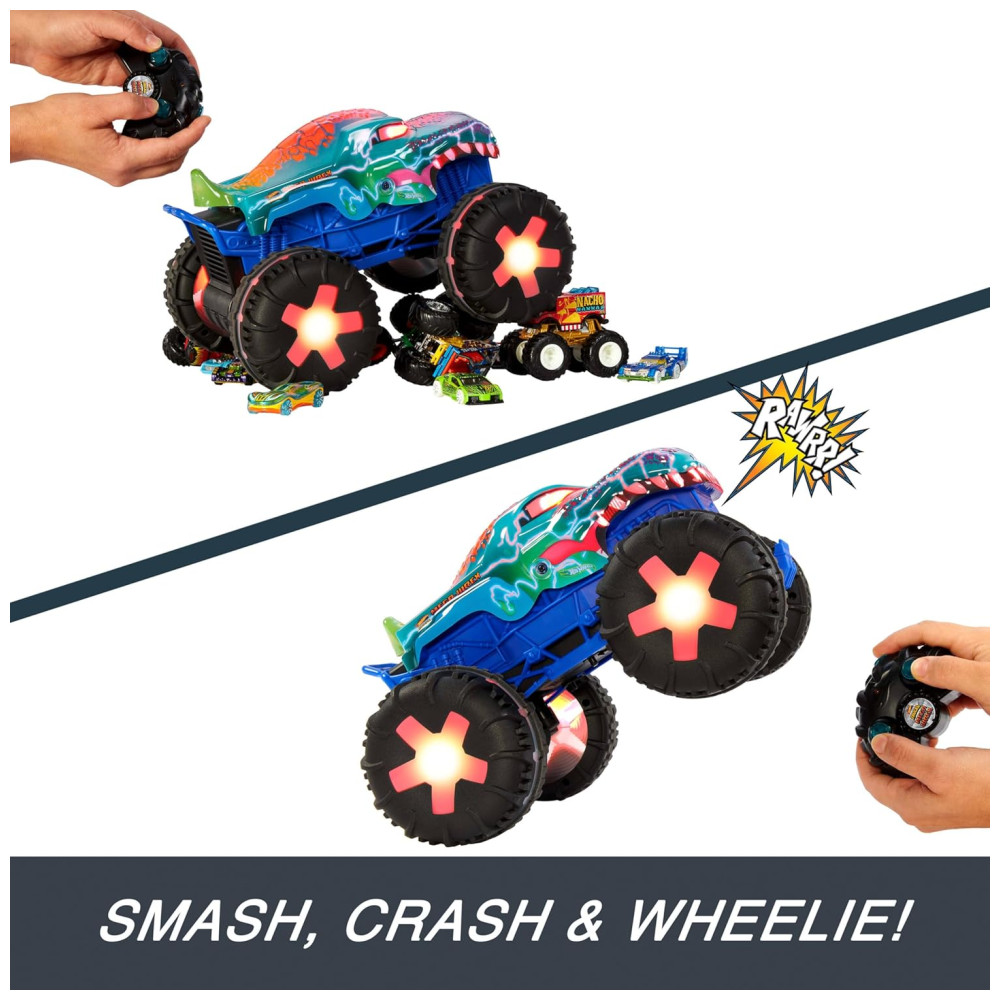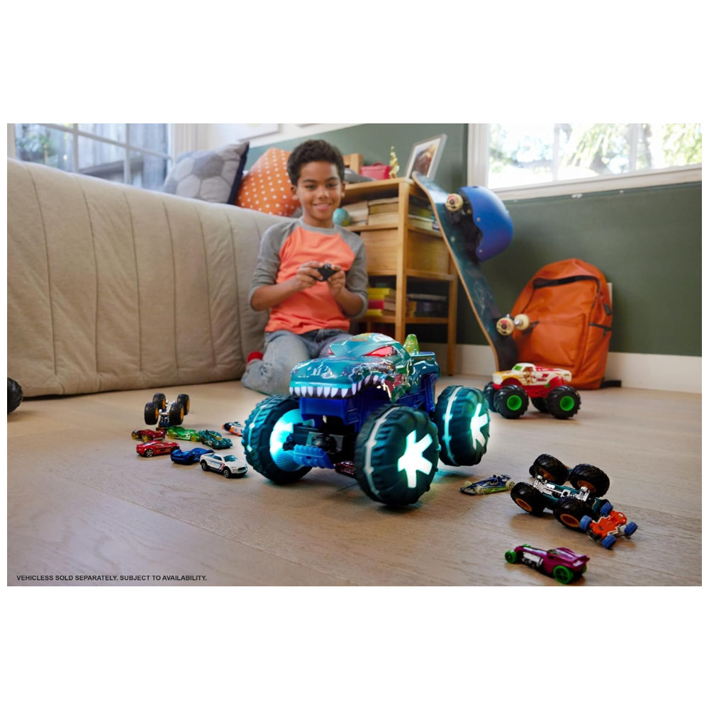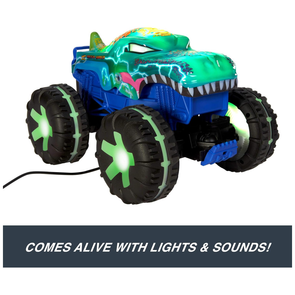O Mega-Wrex da Hot Wheels Monster Trucks ganha vida em um incrível veículo de controle remoto, oferecendo uma experiência única com luzes e sons interativos! Em escala 1:15, este caminhão RC oferece três modos diferentes para diversificar a diversão.