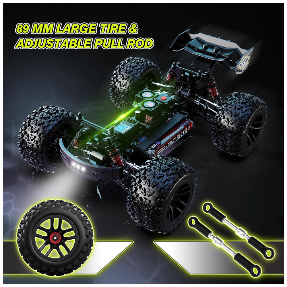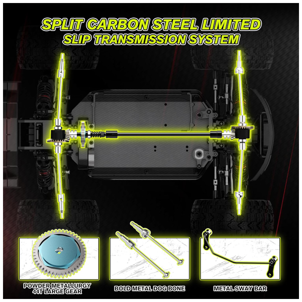 O sistema de tração nas quatro rodas proporciona estabilidade e velocidade emocionantes em todos os tipos de terreno. Suas engrenagens metálicas e diferencial garantem máxima eficiência e potência constante, enquanto os pneus de 89 mm e porcas M3 asseguram uma condução suave.