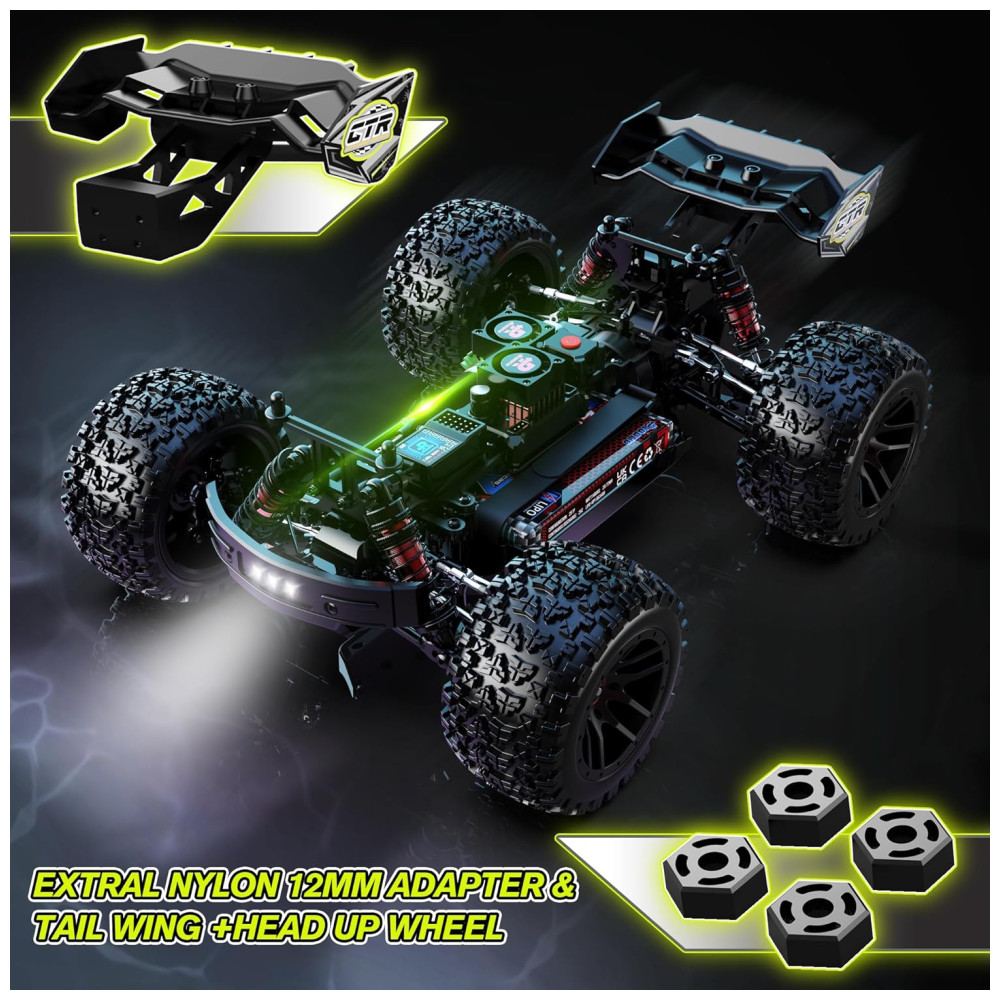 Este caminhão RC é ideal para realizar saltos, cavalinhos e acrobacias como backflips. Inclui uma bateria LiPo recarregável de 2S 7,4V 2800 mAh 25C, permitindo velocidades de até 72 KM/H, perfeitas para adultos, medidas por GPS.