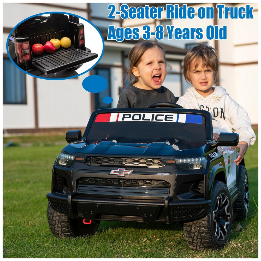 Carro de Polícia Elétrico Infantil Chevrolet Colorado Licenciado 24V 2 Lugares 4WD Controle Remoto Música Alarme Megafone Preto