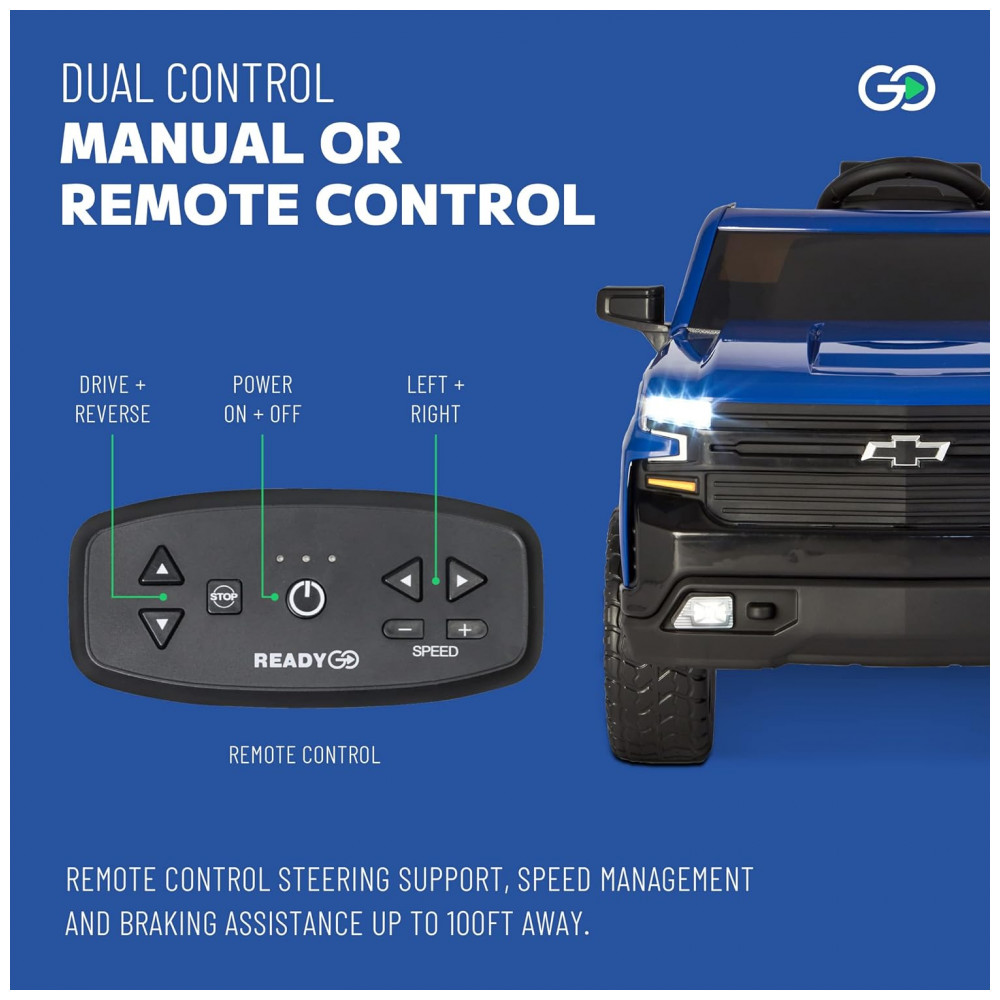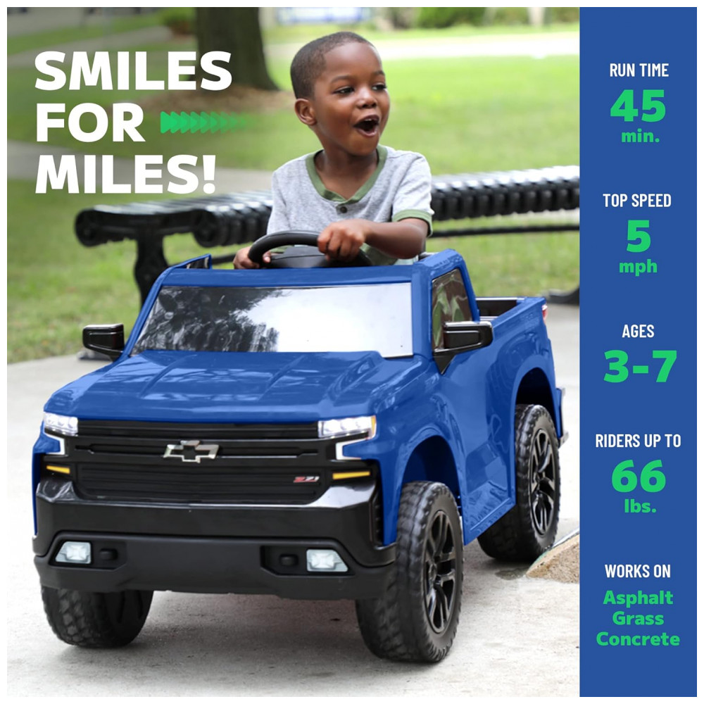 Design elegante e durável O caminhão de coleta de chefe Chevy Silverado Trail de 12V oficialmente licenciado parece o negócio real. Com um logotipo oficial da Chevy, faróis de LED de trabalho, ruídos reais do carro, uma porta traseira que se abre para zenamento, rodas grandes e volante grande, este carro infantil está pronto para chegar à calçada.