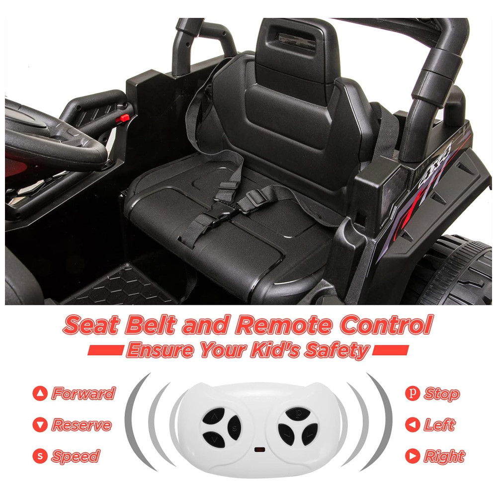 CONDUÇÃO SEGURA E SUAVE A tecnologia de partida suave e a função de prioridade de controle remoto protegem seus filhos do perigo ca por lançamentos e freios da operação abrupta, sistema de suspensão de mola de amortecedor em cada roda, cinto de segurança ajustável e portas com trava garantem uma condução suave e confortável andar em todos os terrenos.