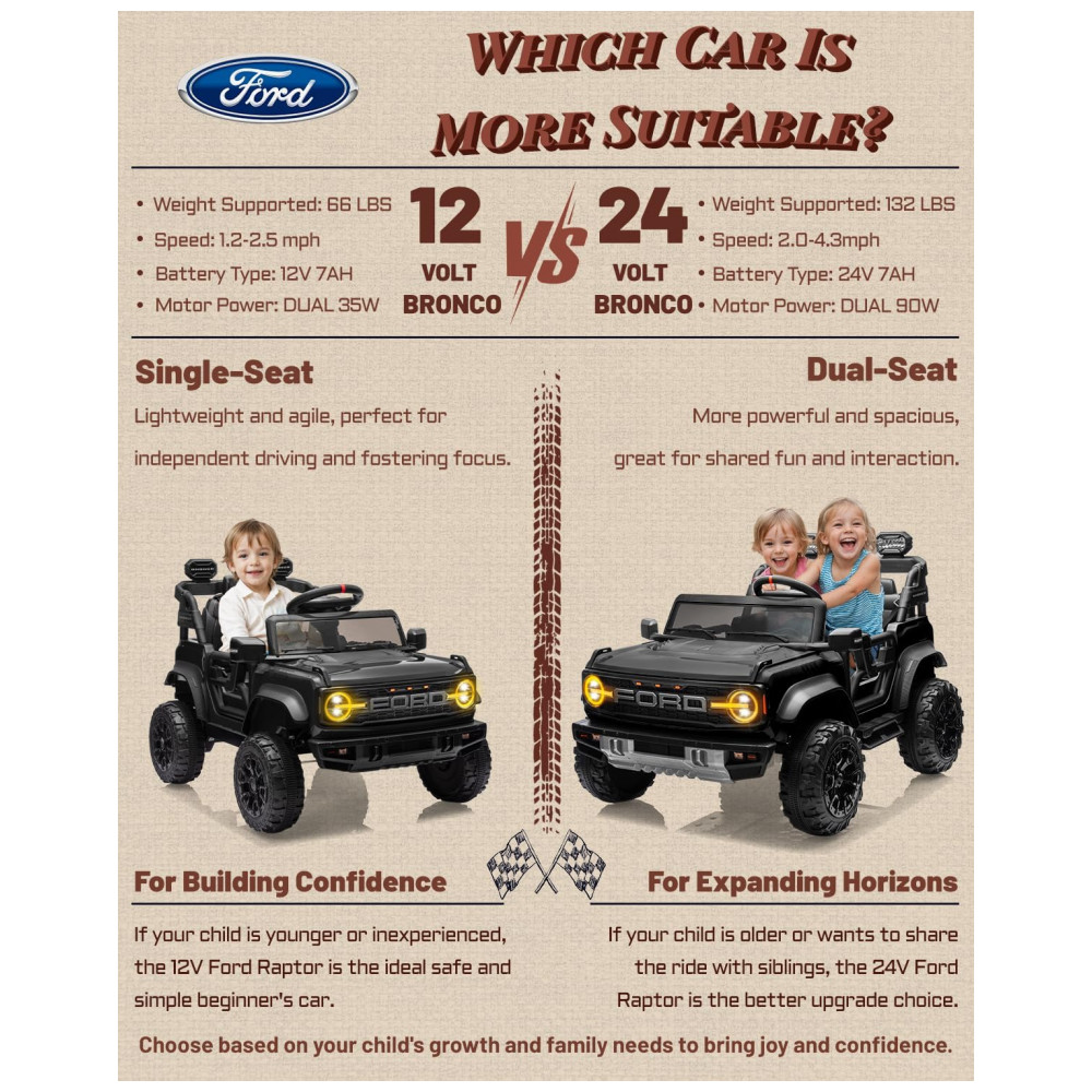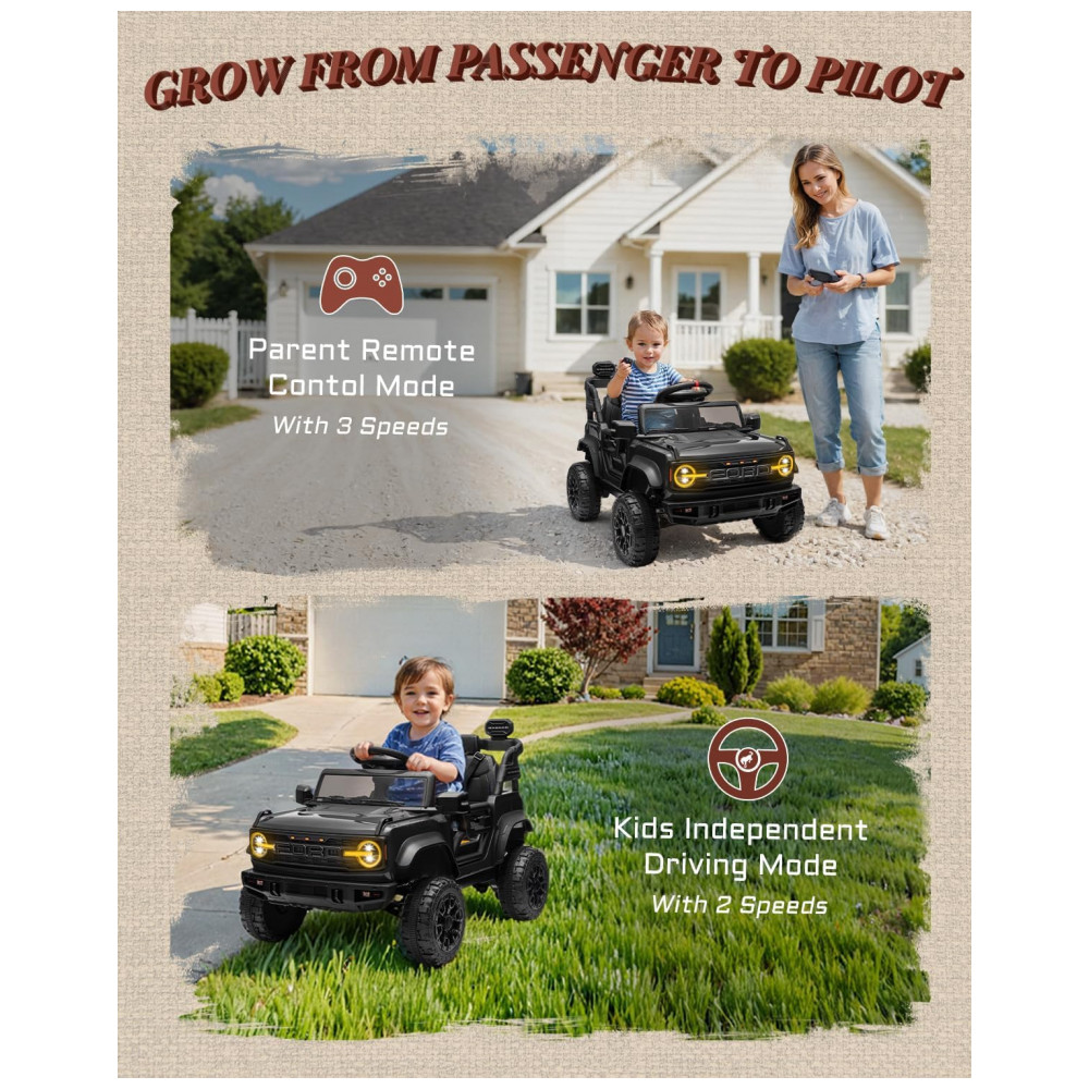Controle e Crescimento: Os pais podem usar o controle remoto para garantir a segurança dos pequenos motoristas, equilibrando diversão e segurança. À medida que seu filho cresce, ele pode assumir o volante, desenvolvendo confiança e habilidades de direção. O Ford Bronco Raptor é projetado para acompanhar o crescimento da criança, sendo um companheiro para muitos passeios alegres e um símbolo de seu progresso.