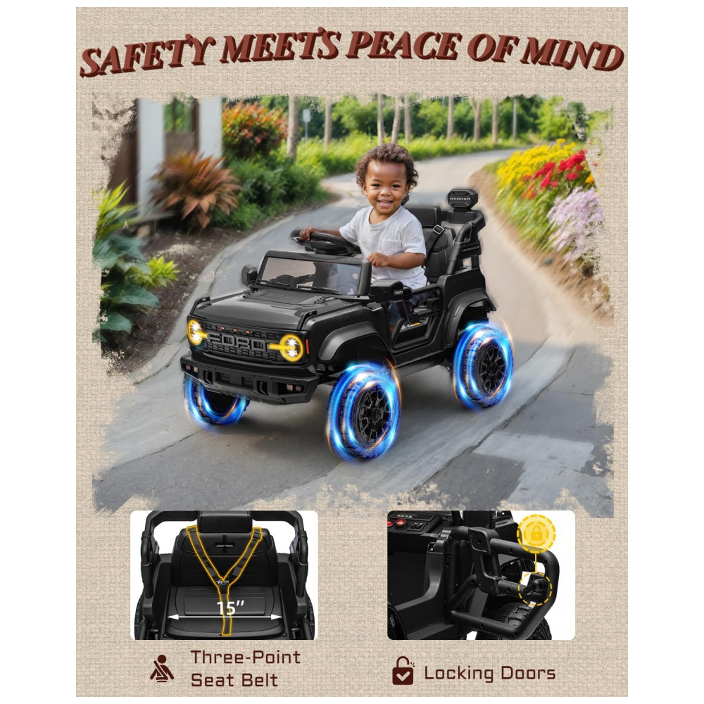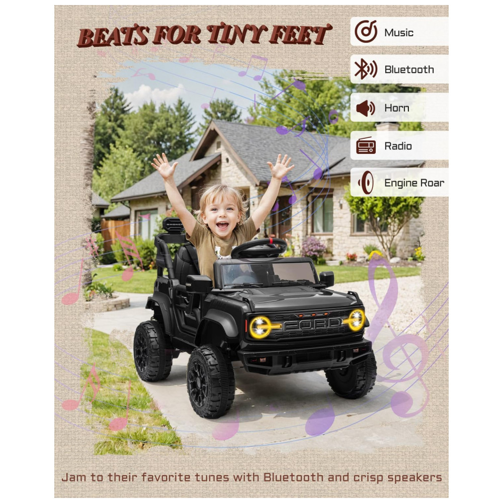 Carro Elétrico Infantil 12V Ford Bronco 1 Assento com Controle Remoto Suspensão nas 4 Rodas Música via Bluetooth First Ride On Preto