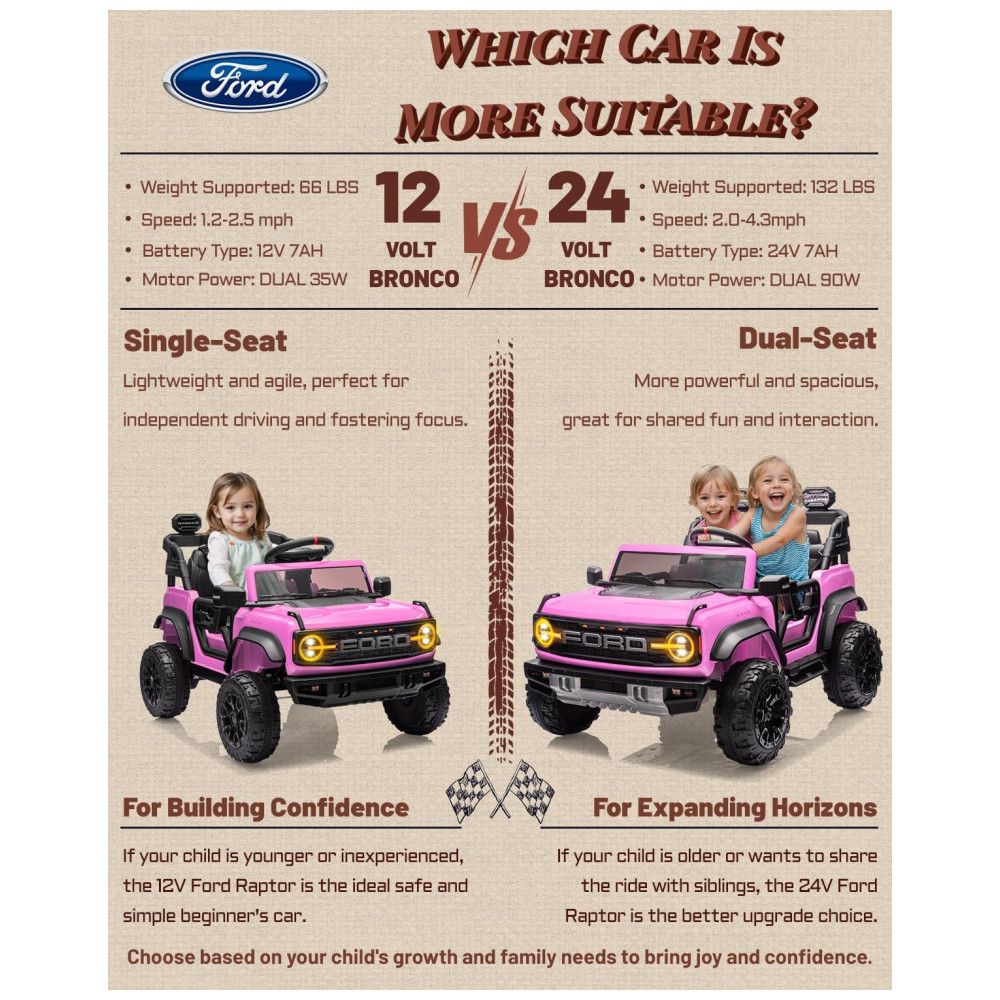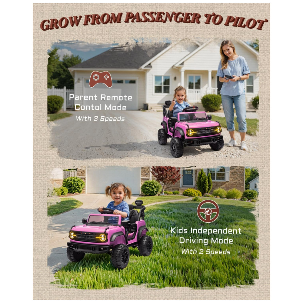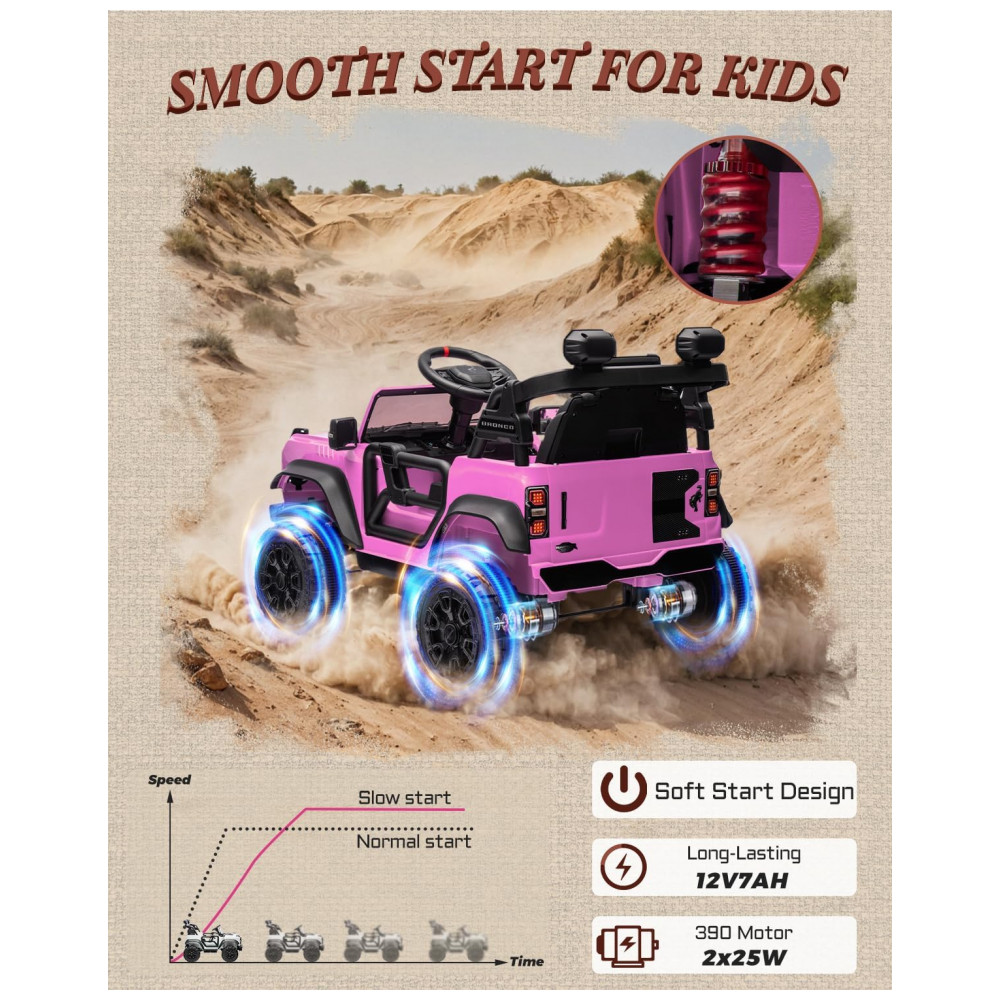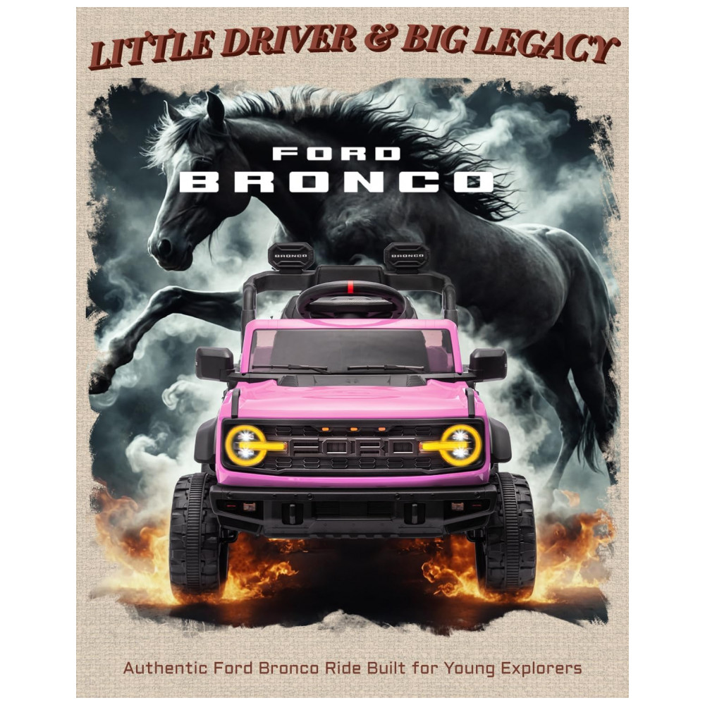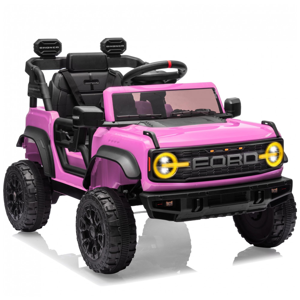 Carro Elétrico Infantil 12V Ford Bronco 1 Assento com Controle Remoto Suspensão nas 4 Rodas Música via Bluetooth First Ride On Rosa