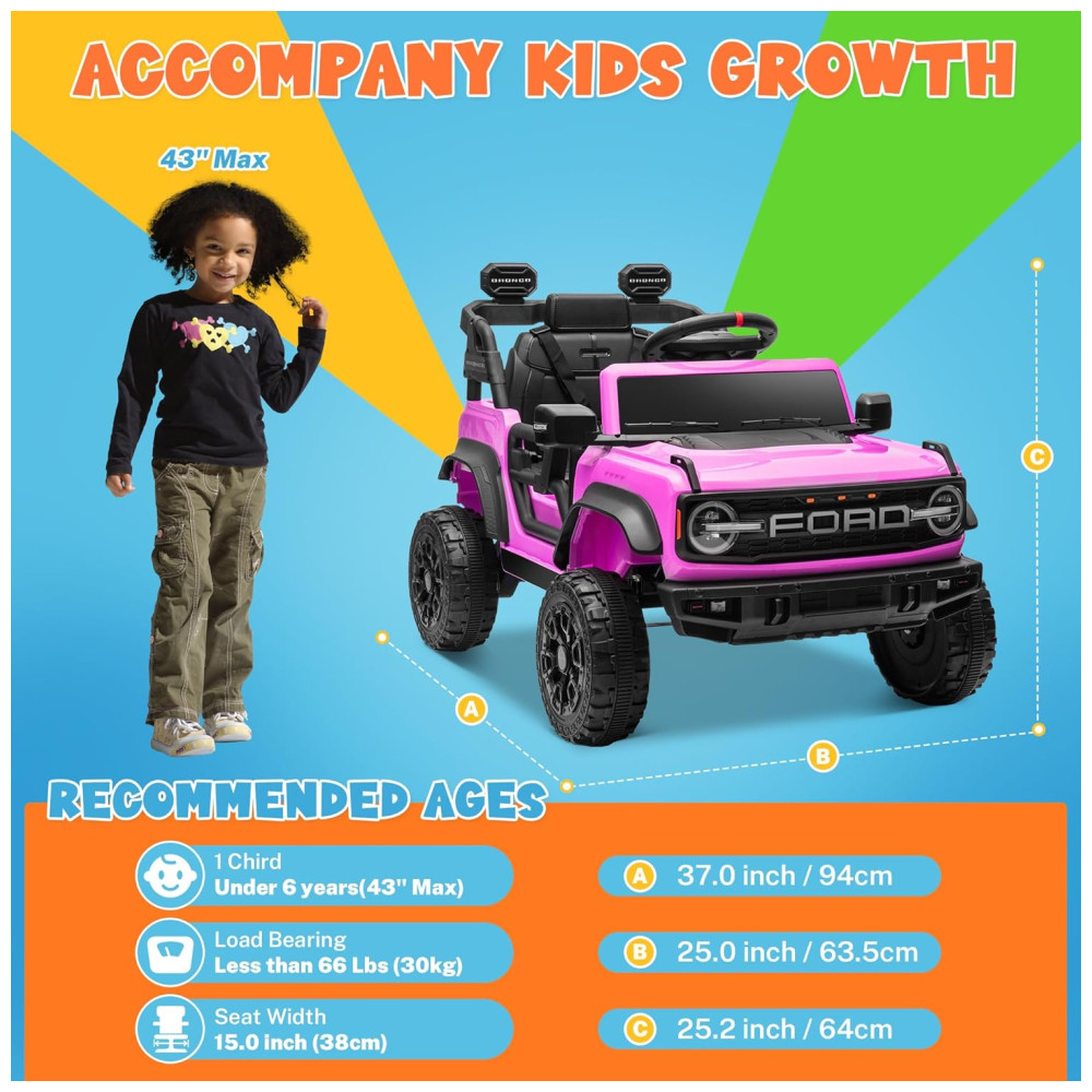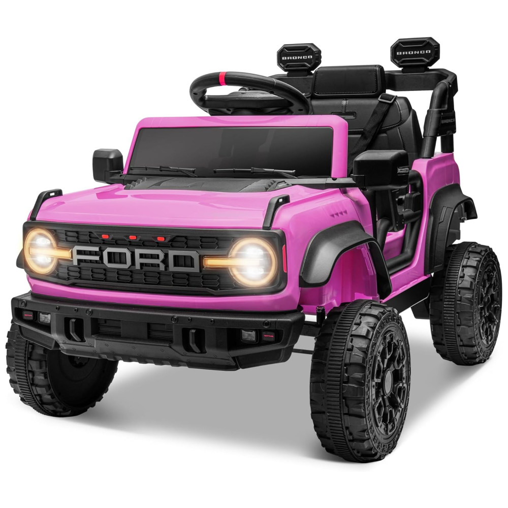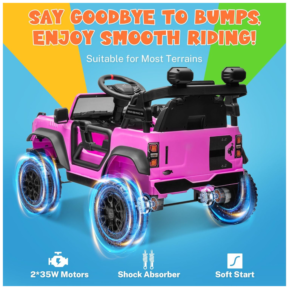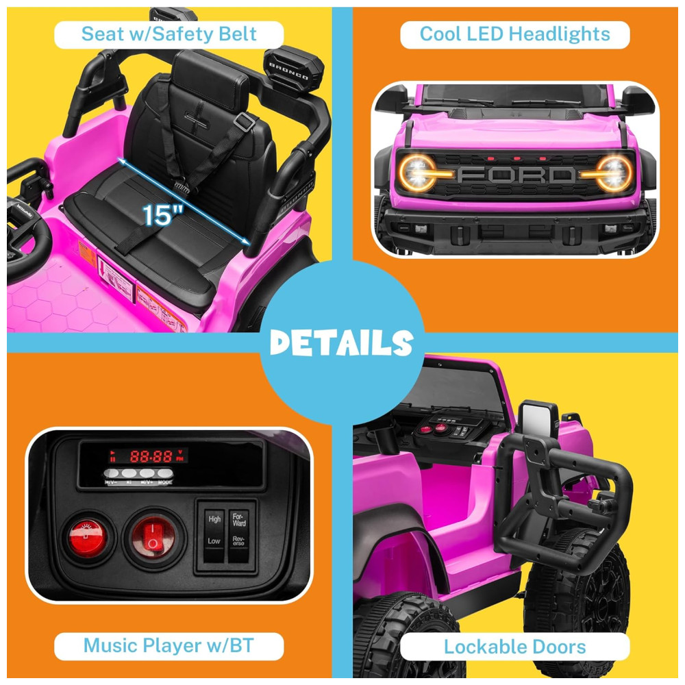Carro Elétrico Infantil 12V Ford Bronco Raptor com Controle Remoto para Pais Suspensão nas 4 Rodas Música via Bluetooth e Luzes LED Seizeen Rosa