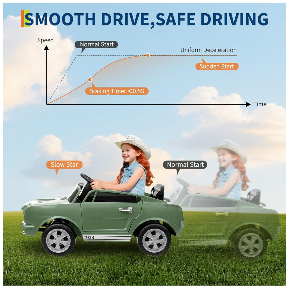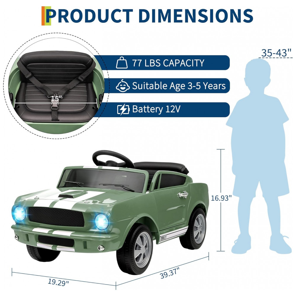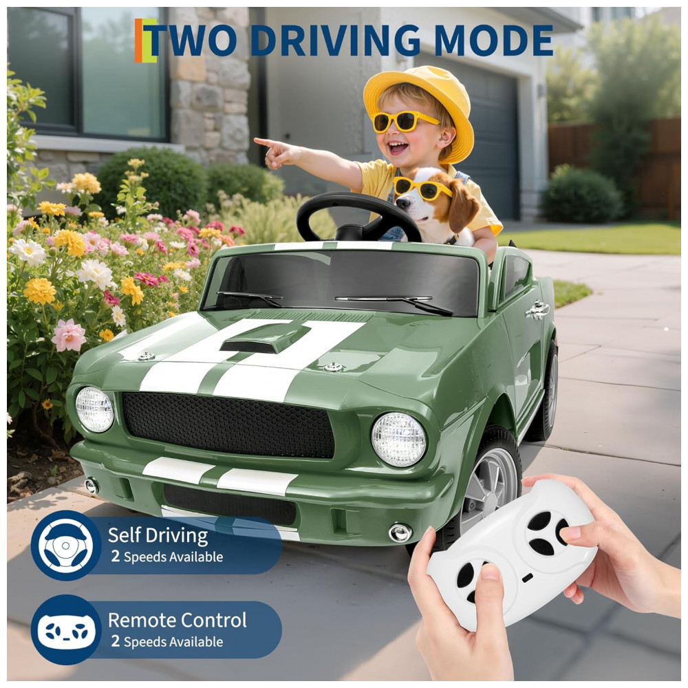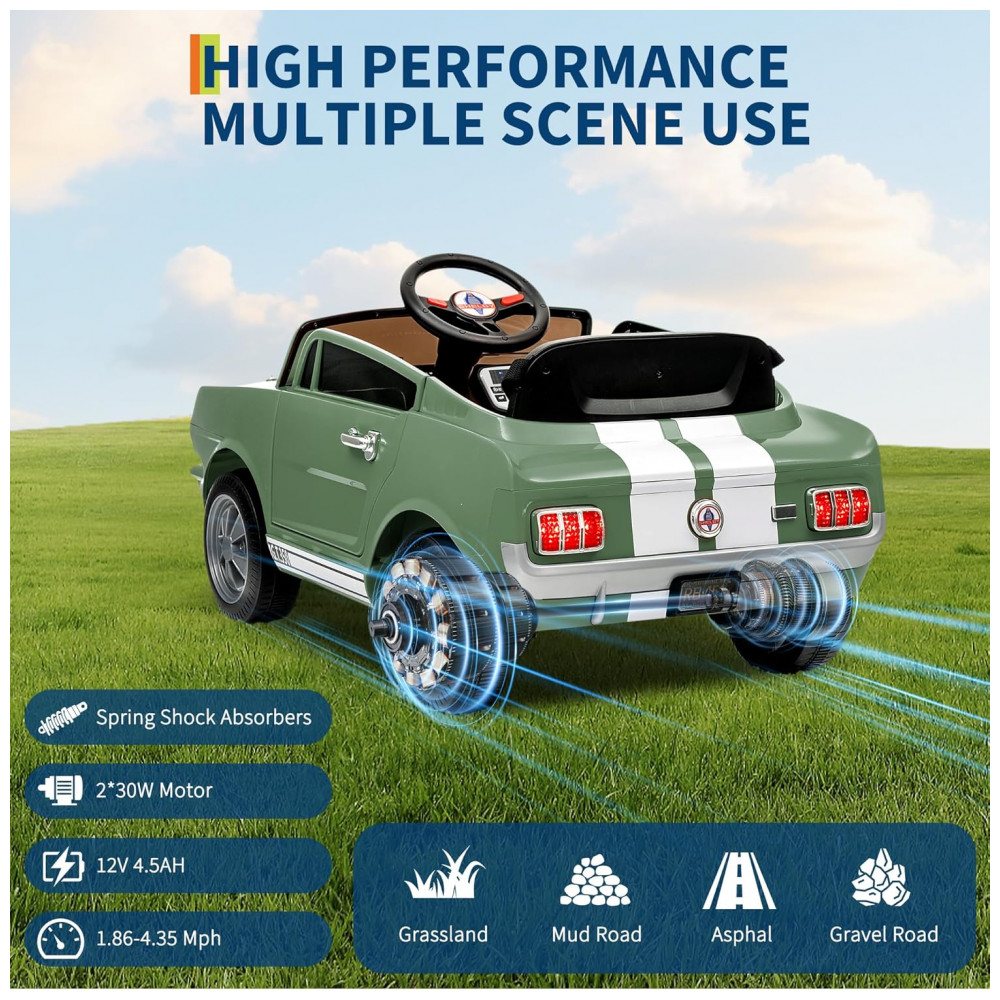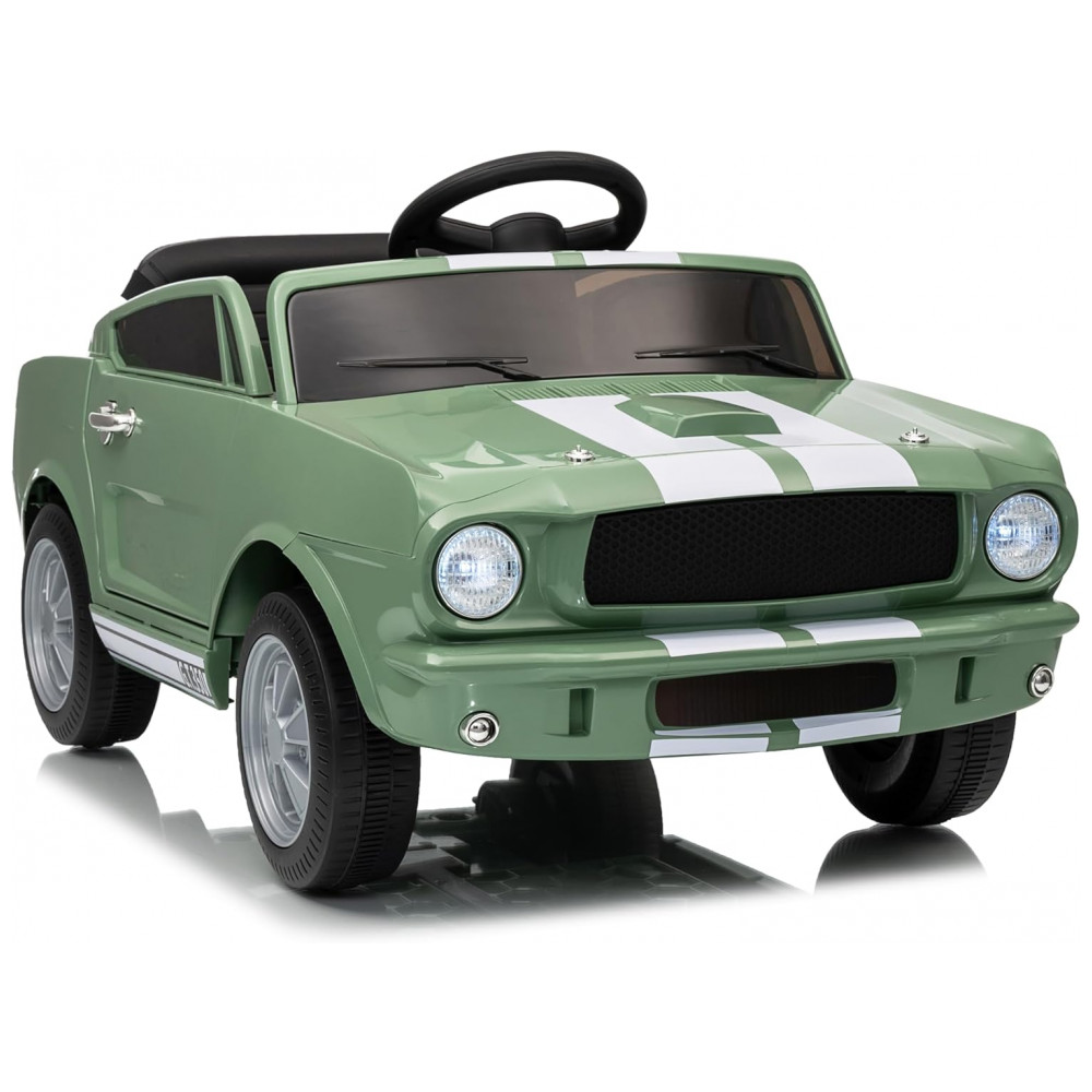 Carro Elétrico Infantil 12V INFANS Shelby Licenciado Controle Remoto Bluetooth Suspensão Cinto de Segurança 3 Velocidades Verde