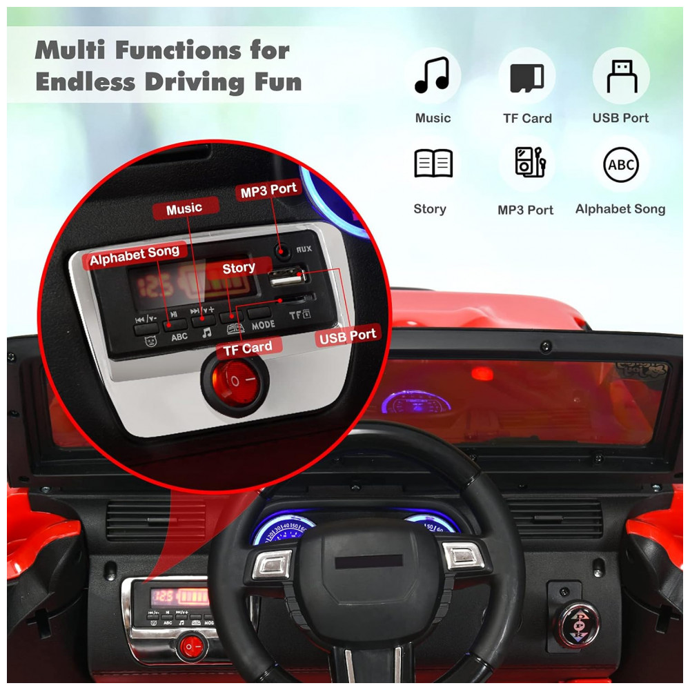 As luzes LED realistas, portas duplas magnéticas com trava, funções para frente e para trás e a função de ajuste de velocidade de 3 níveis proporcionam ao seu filho uma experiência de direção real. Função de contar histórias e tocar música conectando se ao MP3 player ou outros dispositivos através da entrada AUX, porta USB e slot para cartão TF, trazendo mais alegria para seus filhos.