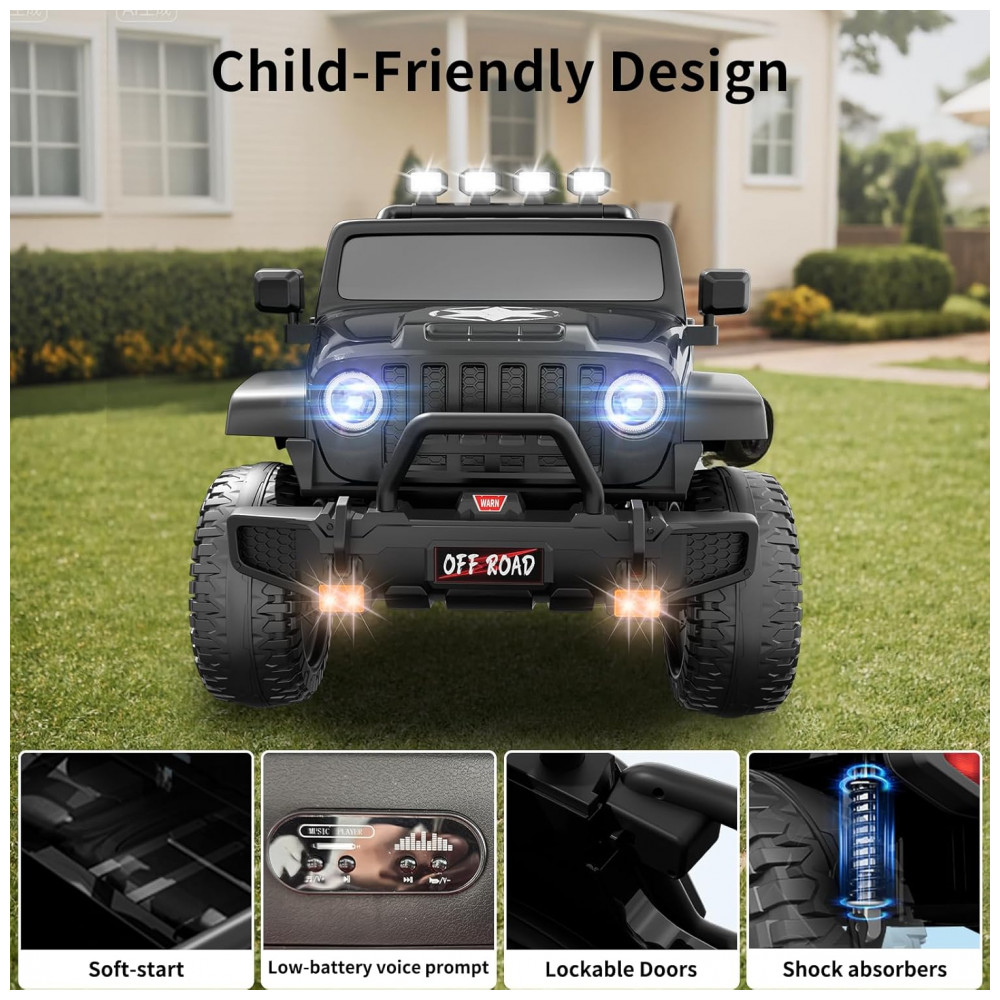 Dispõe de suspensão independente nas quatro rodas, pneus em PP antiderrapante, partida suave (soft start) e joystick ou volante para operação infantil. O controle remoto parental (alcance até 100 m) permite direção, mudança de sentido, ajuste de velocidade e acionamento da função de segurança com frenagem de emergência.