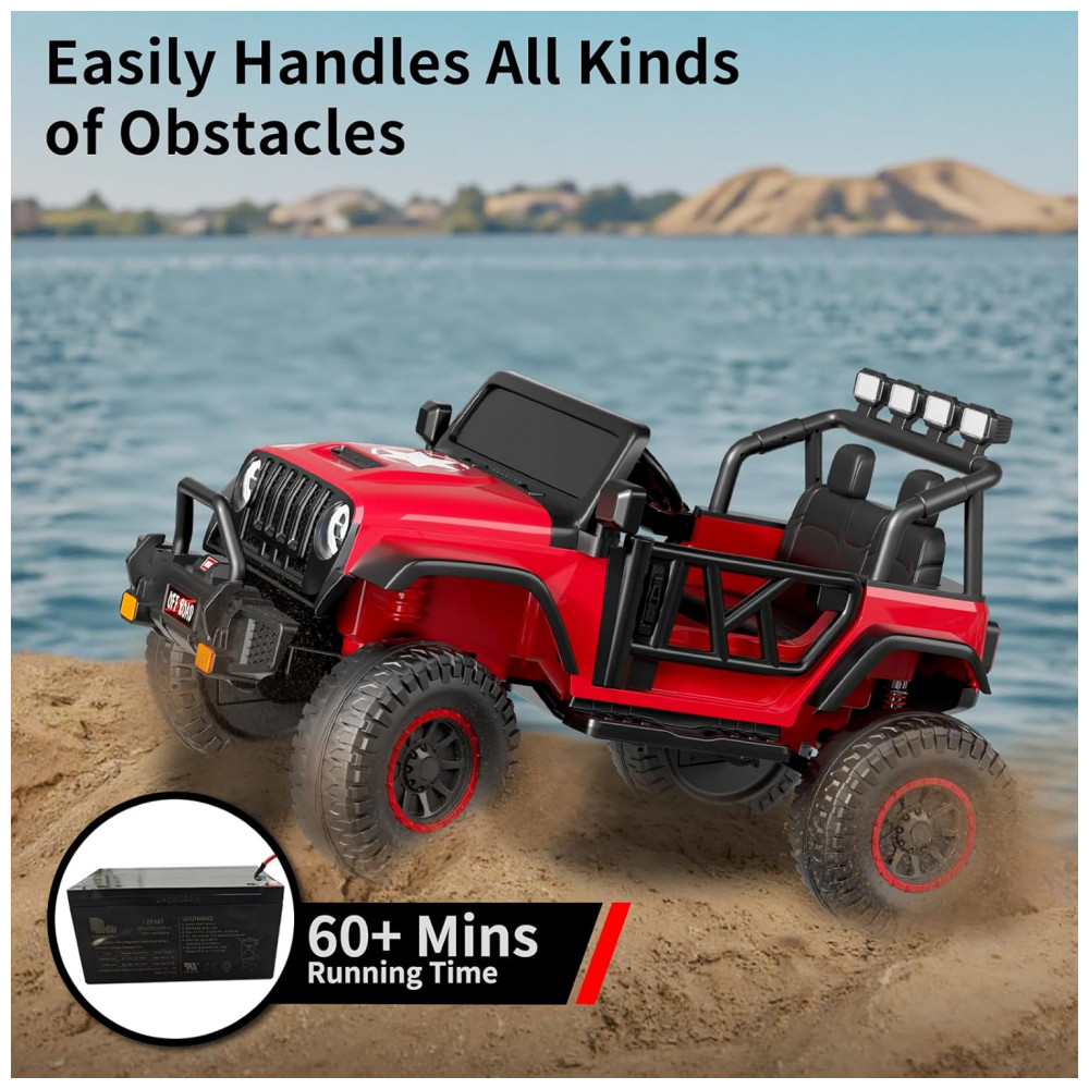 Dispõe de suspensão independente nas quatro rodas, pneus em PP antiderrapante, partida suave (soft start) e joystick ou volante para operação infantil. O controle remoto parental (alcance até 100 m) permite direção, mudança de sentido, ajuste de velocidade e acionamento da função de segurança com frenagem de emergência.