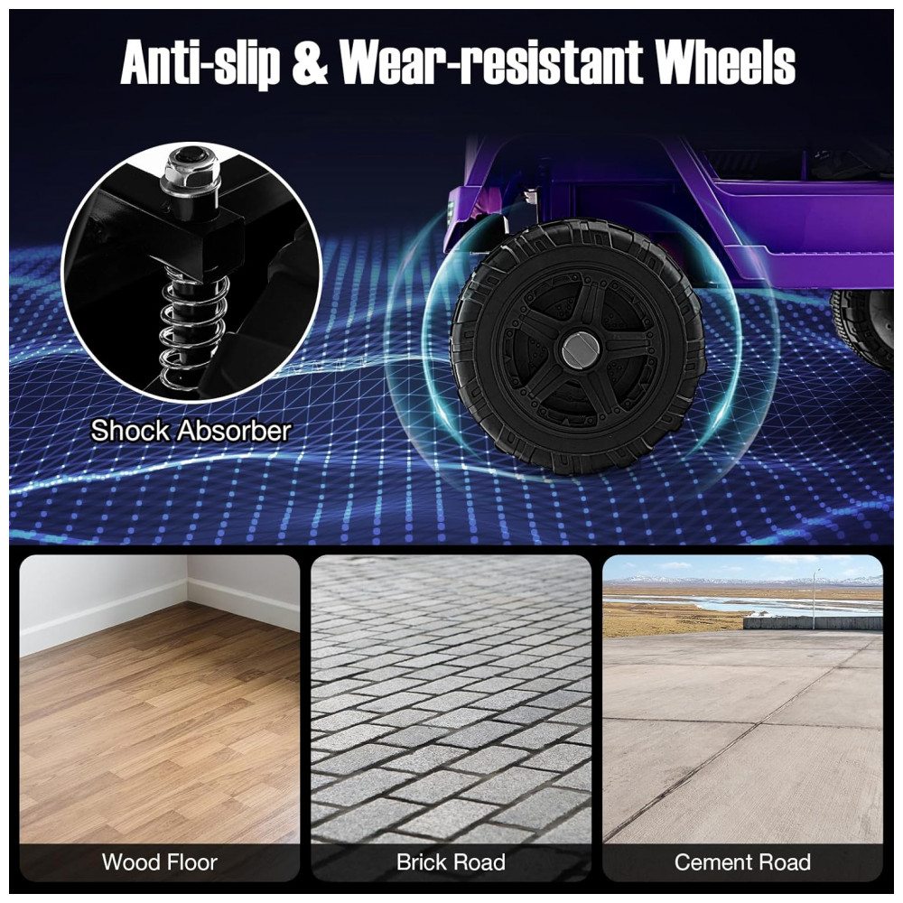 Rodas antiderrapantes para uma condução suave Rodas antiderrapantes e resistentes ao desgaste com amortecedor garantem uma direção suave e estável no piso de madeira, estrada de tijolos ou estrada de cimento, o que oferece às crianças mais opções de direção ao ar livre. E 2 motores potentes integrados garantem uma faixa de velocidade segura de aproximadamente 2,4 a 4,5 km, h. Assim, as crianças podem começar a sua aventura com segurança onde quiserem.