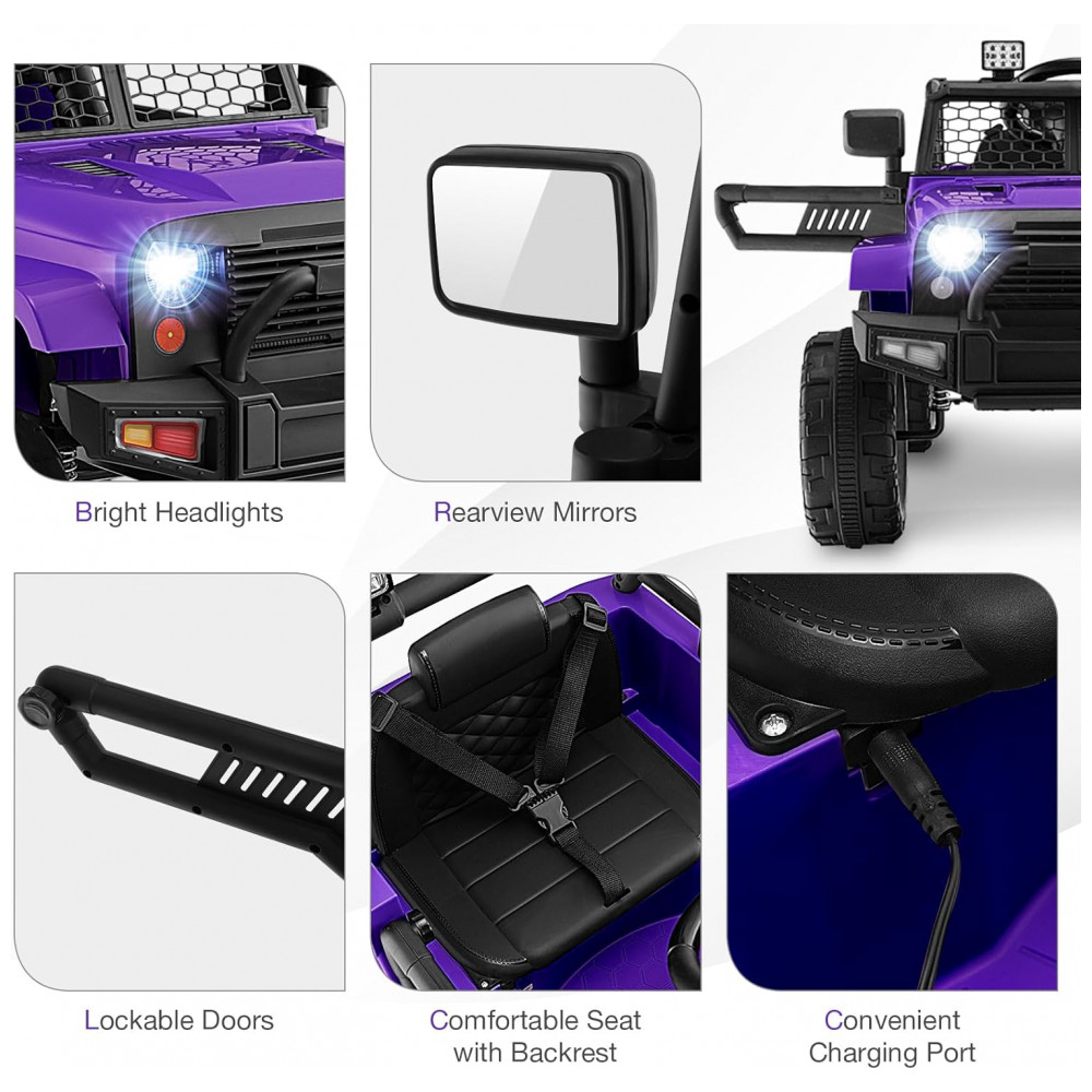 Proteção de segurança múltipla Vem com 2 portas com fechadura e assento ergonômico com encosto e cinto de segurança, as crianças estarão totalmente protegidas quando estiverem dirigindo. E com a função de partida lenta, este passeio no caminhão pode dar às crianças um amortecedor quando em aceleração repentina. O para brisa de malha especial e os faróis brilhantes permitem que as crianças aproveitem a experiência de dirigir sozinhas.