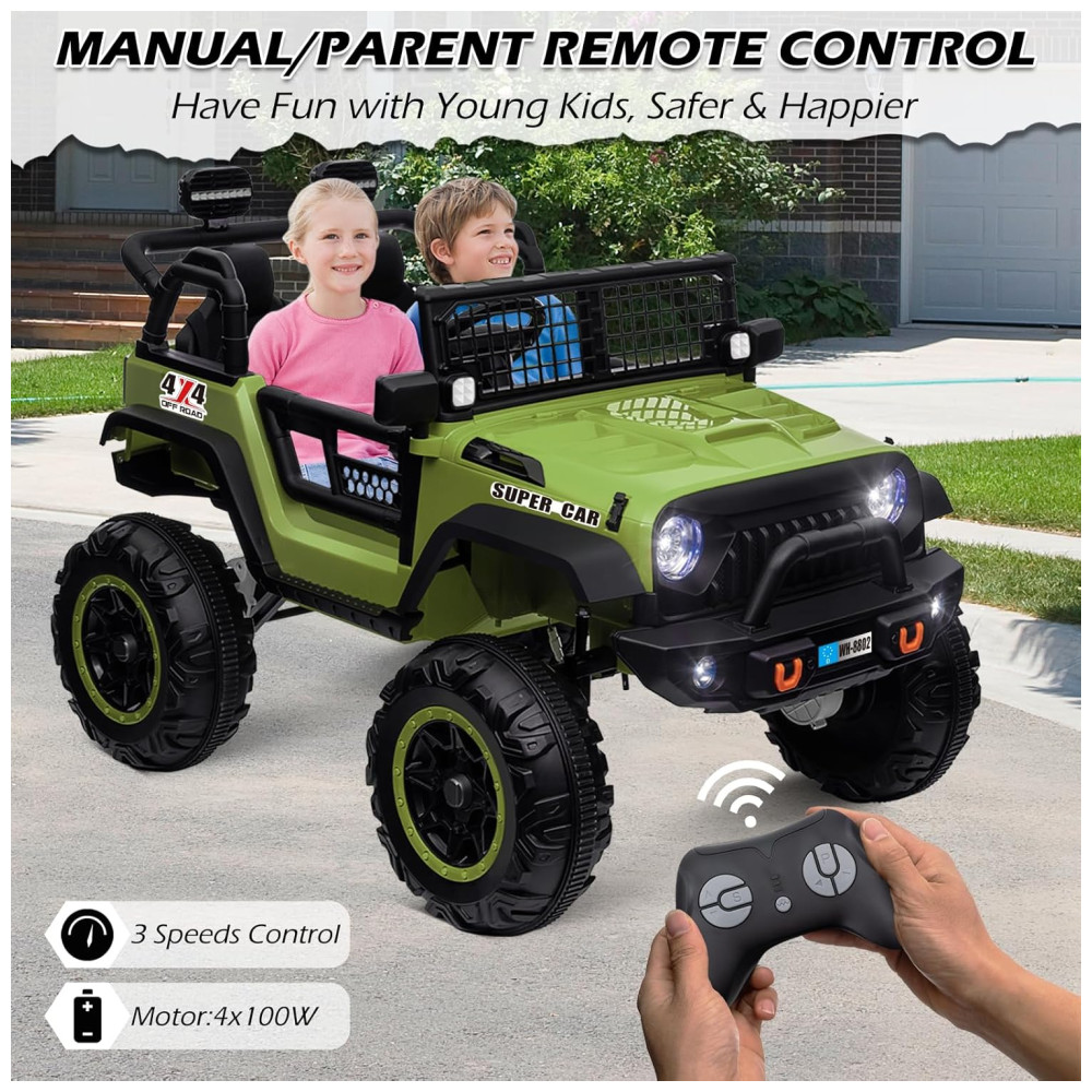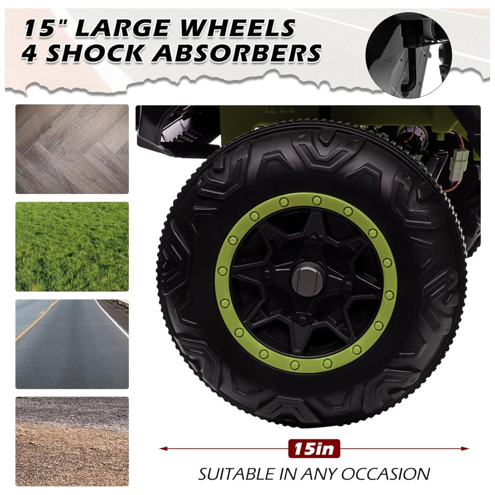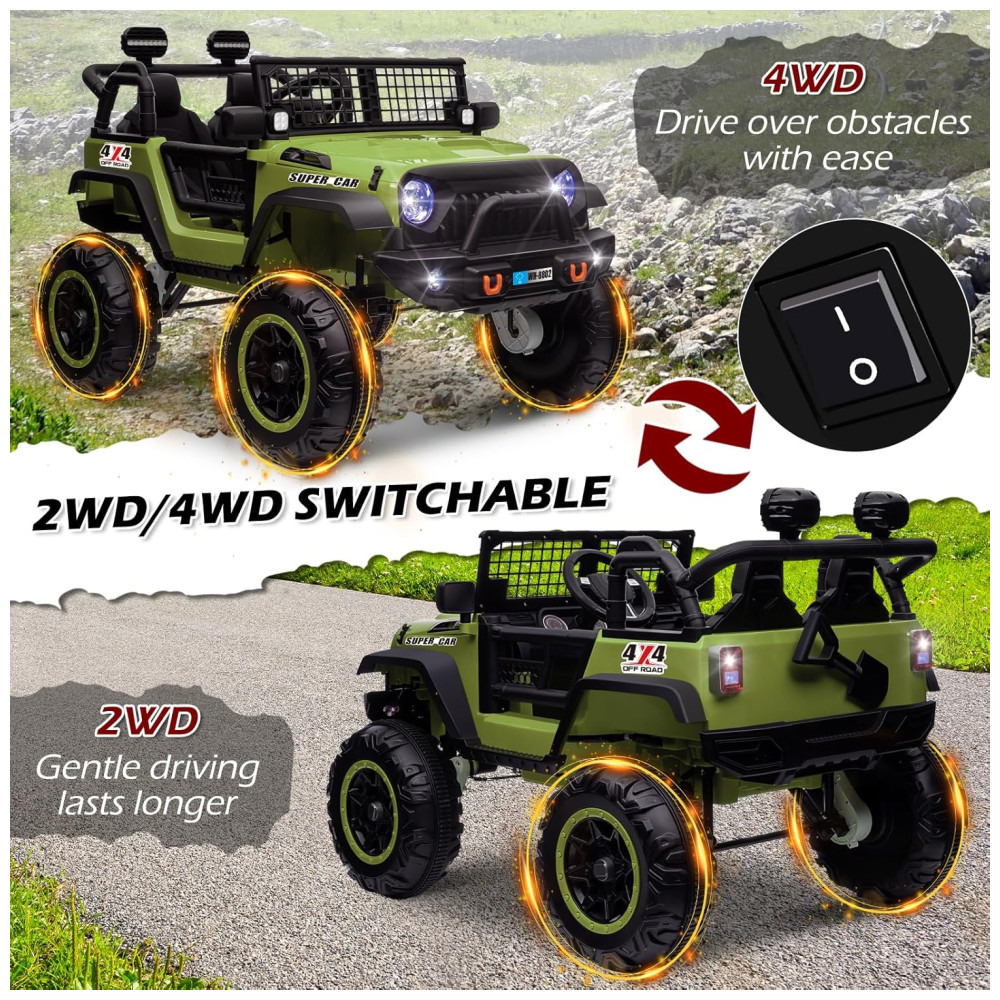Este veículo elétrico infantil de 24V possui um motor comutável 4WD2WD que é equipado com quatro motores potentes de 100W, proporcionando uma potência forte e estável. O modo 4WD é ideal para superar obstáculos, enquanto o modo 2WD é eficiente para dirigir em superfícies planas por longos períodos. Ao contrário do passeio de carro com duas baterias de 12V conectadas em série, este carro elétrico tem uma única bateria de 24V, que é potente o suficiente para suportar 12 horas de carga total.