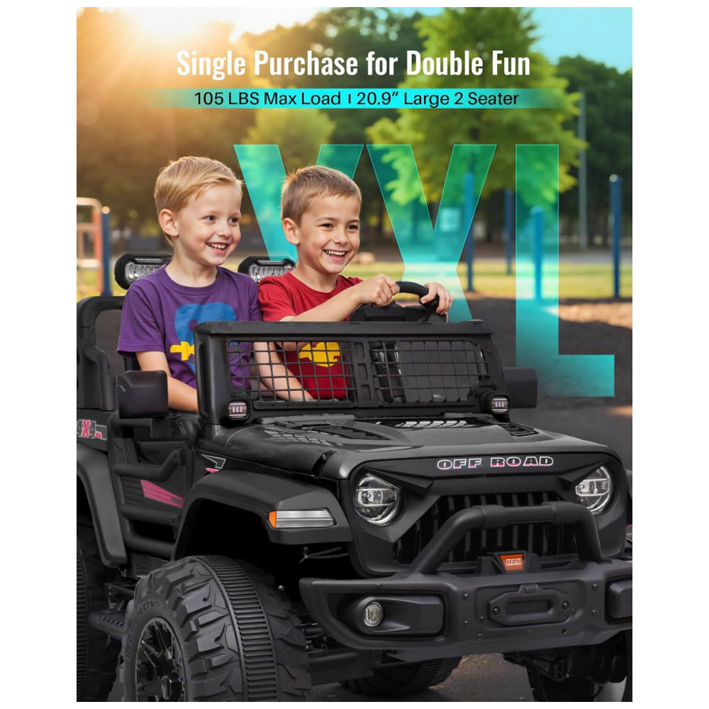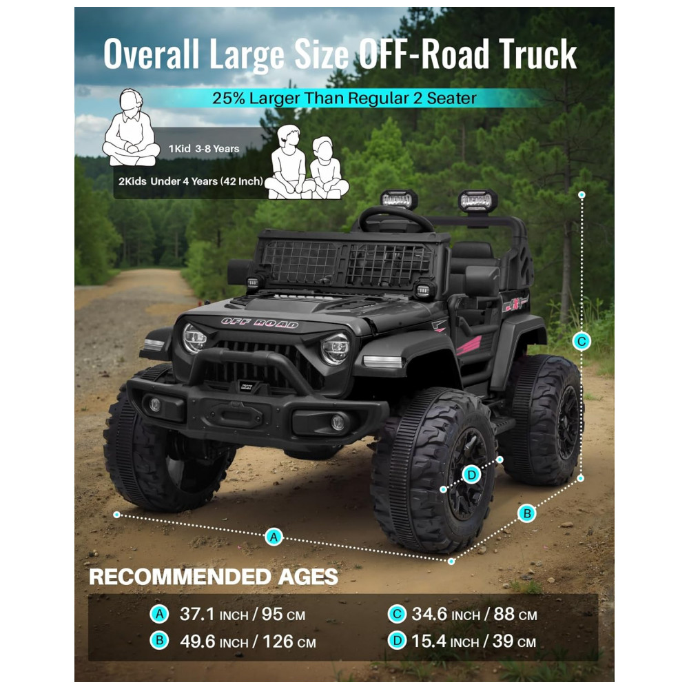 Tamanho geral grande e 2 lugares espaço máximo O passeio convencional de dois lugares está sempre lotado quando duas crianças se sentam é desconfortável para as duas crianças. Este veículo resolve esses problemas perfeitamente com dois assentos estendidos e espaço suficiente na cabine, o que pode manter as crianças em total conforto durante a viagem. E usando rodas de tamanho grande de , a distância entre as rodas pode ser alcançada , o que pode refletir melhor o desempenho OFF ROAD.