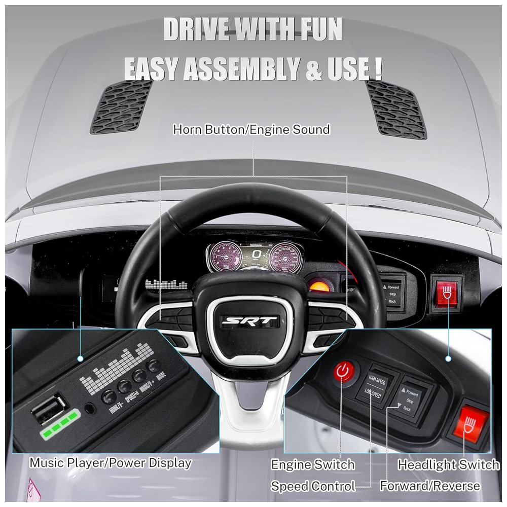 Este carro elétrico Dodge Muscle para crianças que chama a atenção vem armado com buzina, sons de inicialização, aceleração realista do pedal, direção suave, faróis LED funcionais e função de avanço e ré para uma experiência de direção realista. Além de tocar músicas e estações de rádio integradas, este carro de passeio para meninos e meninas suporta conexão AUX, USB ou Bluetooth para tocar músicas, histórias e canções infantis que as crianças adoram.