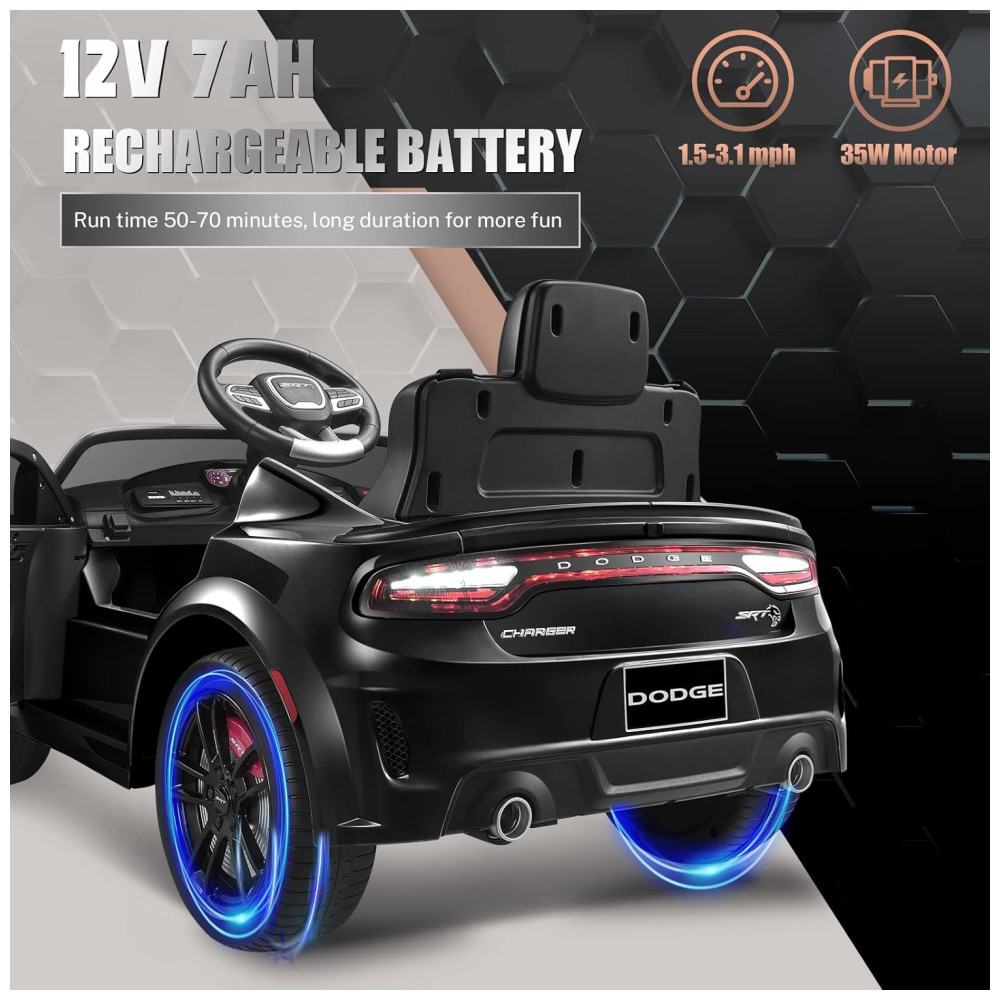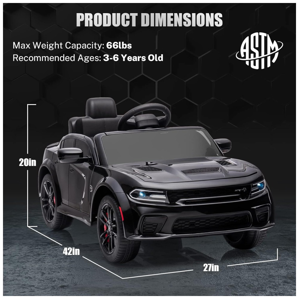Carro Elétrico Infantil a Bateria com Controle Remoto 3 Velocidades Luzes LED e Música 12V ENYOPRO Dodge Charger licenciado SRT Hellcat Preto