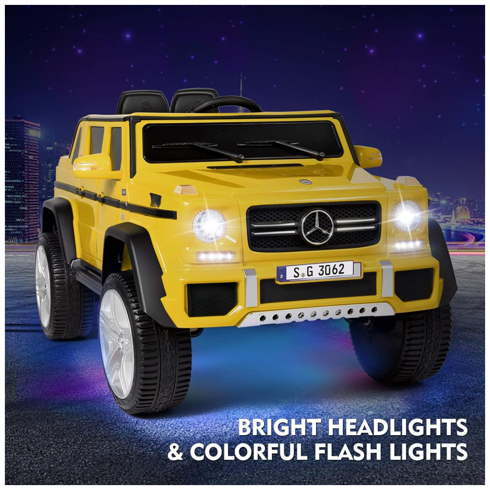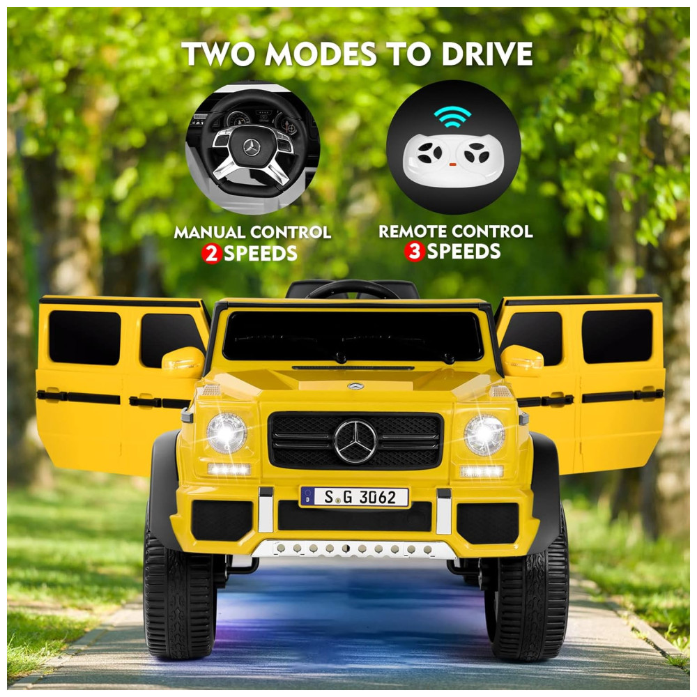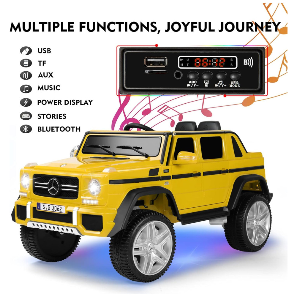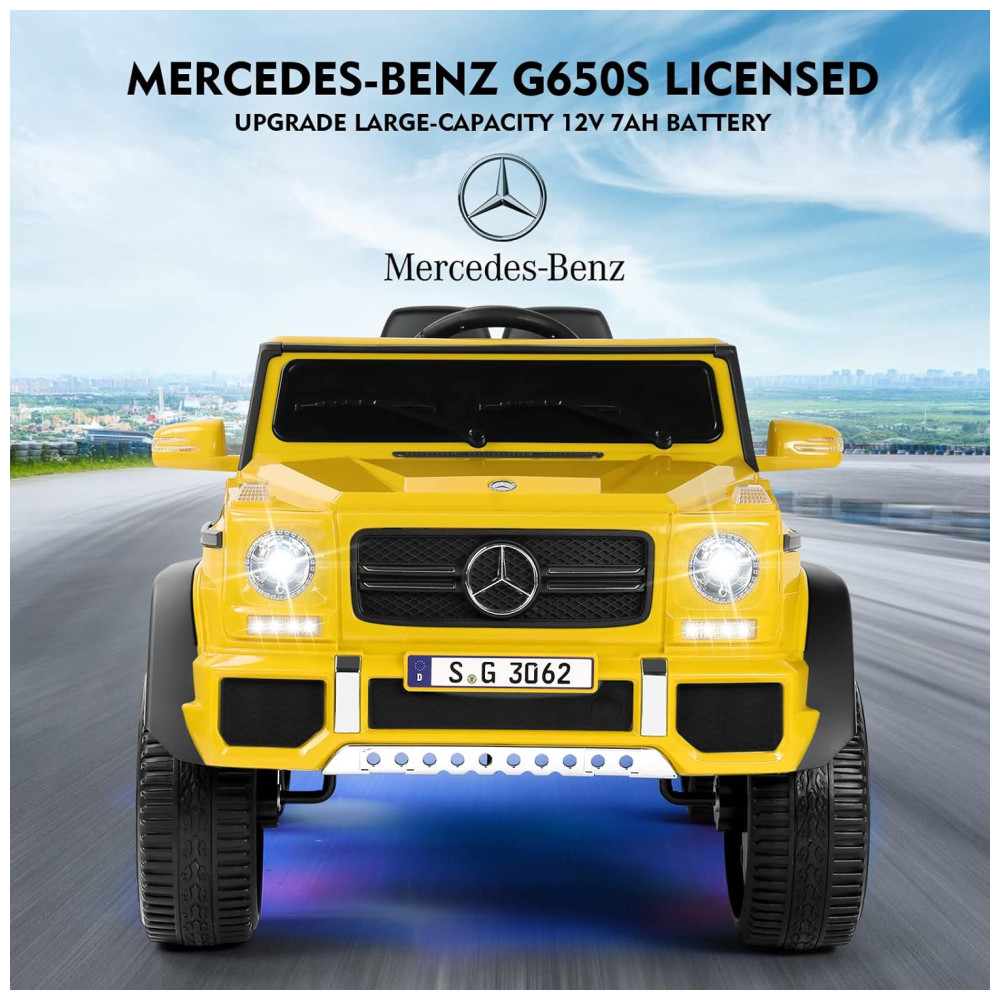 Este é o carro infantil oficialmente licenciado MercedesBenz G650S, com dois modos de operação. As crianças podem operar os carros elétricos através dos pedais e do volante para aproveitar as 2 velocidades diferentes. Os pais também podem controlar o carro infantil através do controle remoto de 2,4 GHz que possui três velocidades. O carro com bateria 12V7AH pode funcionar continuamente por 4.560 minutos e possui diversas funções, como a porta AUX integrada, USB, slot TF, música e história, buzina e luzes LED de alto brilho para dirigir à noite.