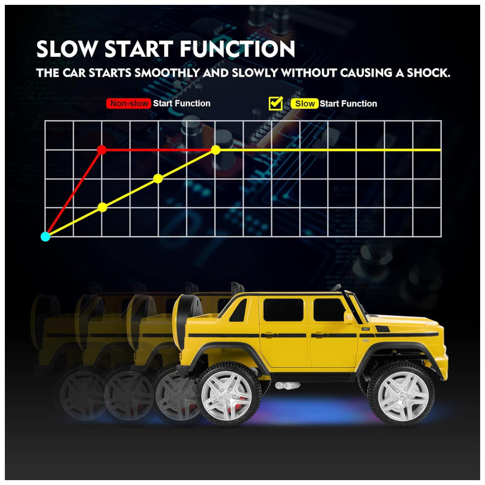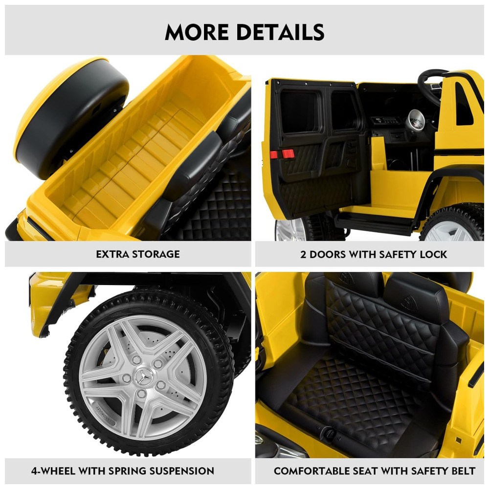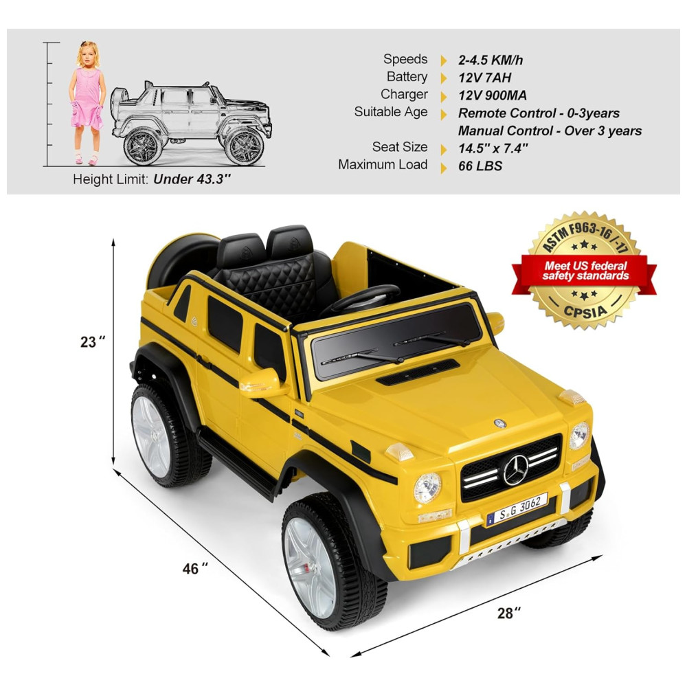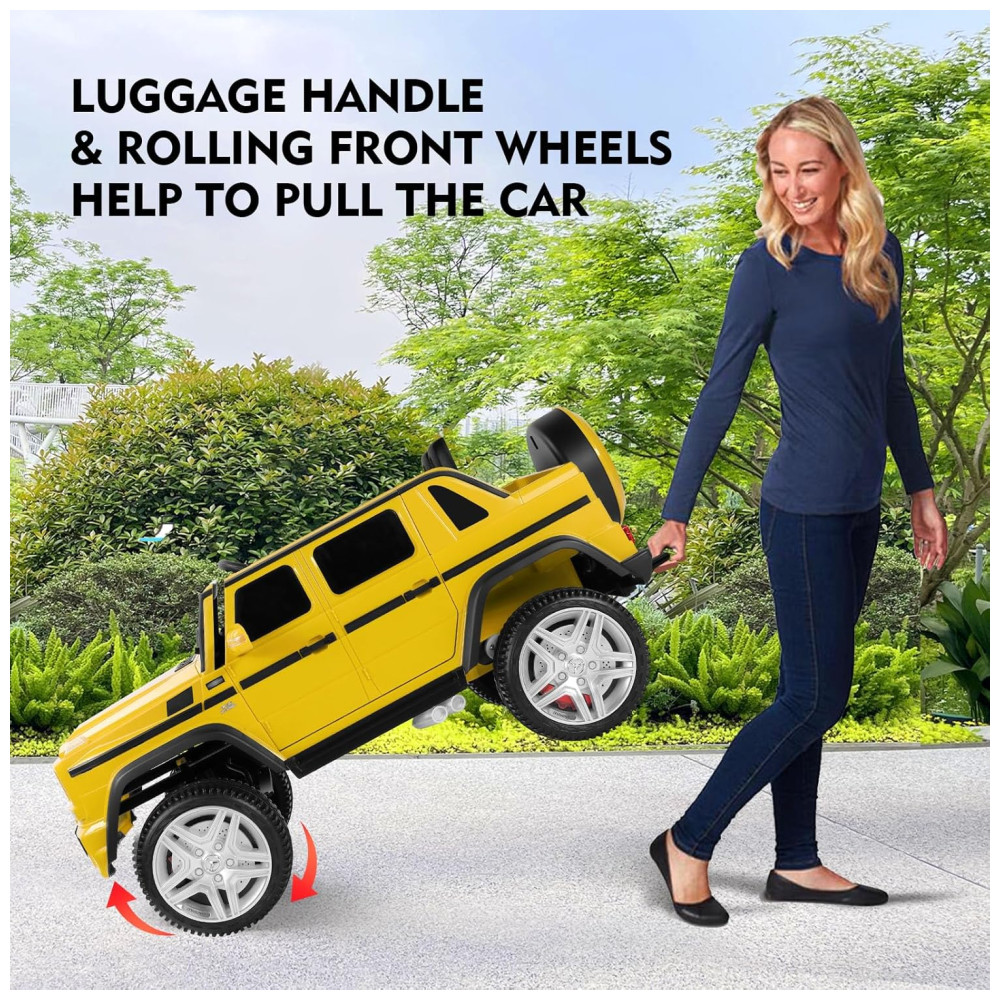 Este é o carro infantil oficialmente licenciado MercedesBenz G650S, com dois modos de operação. As crianças podem operar os carros elétricos através dos pedais e do volante para aproveitar as 2 velocidades diferentes. Os pais também podem controlar o carro infantil através do controle remoto de 2,4 GHz que possui três velocidades. O carro com bateria 12V7AH pode funcionar continuamente por 4.560 minutos e possui diversas funções, como a porta AUX integrada, USB, slot TF, música e história, buzina e luzes LED de alto brilho para dirigir à noite.