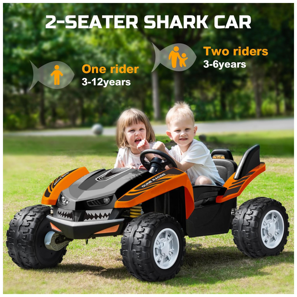 O carro elétrico ANPABO, inspirado em tubarão, proporciona diversão e segurança para crianças de 3 a 12 anos com espaço para dois ocupantes, assento amplo de 21″ e cintos individuais. Equipado com quatro motores de 200W cada, 24V de potência, suspensão independente e pneus EVA antiderrapantes, é ideal para terrenos irregulares e aventuras off-road. Capacidade máxima para até 50 kg, painel com joystick reversível, interruptor de velocidade (2-5,1 km/h), sistema de travas nas portas, rádio com Bluetooth, luzes LED, bateria recarregável de 7Ah e controle remoto parental com parada de emergência. Baixo centro de gravidade, design robusto e mesa de som com ajuste de volume e indicador de carga no display.