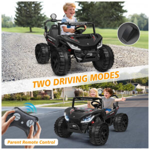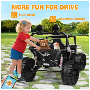 O carro elétrico infantil ANPABO proporciona potência, segurança e diversão para crianças de 3 a 12 anos, com quatro motores de 200W, 24V de potência, suspensão independente com quatro molas e pneus antiderrapantes para todos os tipos de terreno. O modelo possui dois assentos individuais com cintos de segurança ajustáveis, estrutura reforçada em metal, espaço interno ampliado e controle remoto para operação dos pais com três velocidades e parada de emergência. Destaque para os efeitos Rainbow LED, luzes frontais e traseiras, sistema de som integrado, conexão Bluetooth para músicas e histórias, além de compartimento de armazenamento para brinquedos. Capacidade máxima de 63 kg, fácil de montar, e ideal para presente de aniversário ou Natal.