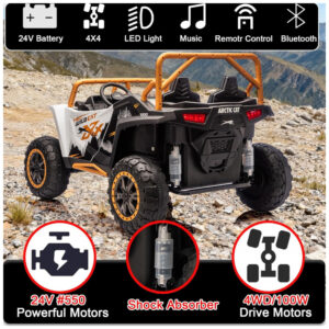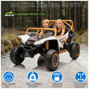 O Carro Elétrico Infantil Arctic Cat UTV 24V é um brinquedo oficial licenciado, com design realista de veículo off-road que proporciona uma experiência de direção emocionante e imersiva para crianças. Equipado com uma potente bateria 24V e quatro motores de 150W, oferece desempenho robusto para aventuras em diferentes terrenos com velocidade entre 5 e 9,6 km/h.