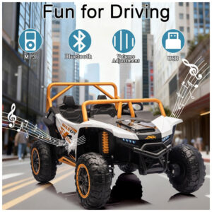 O entretenimento é garantido com MP3 player, conexões AUX, USB, TF Card e Bluetooth, oferecendo música para tornar cada passeio divertido. O controle remoto parental permite que os pais assumam o comando para total segurança, com controle de direção, velocidade e marcha à ré, ideal para iniciantes.