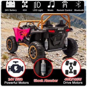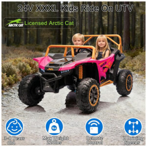 O Carro Elétrico Infantil Arctic Cat UTV 24V é um brinquedo oficial licenciado, com design realista de veículo off-road que proporciona uma experiência de direção emocionante e imersiva para crianças. Equipado com uma potente bateria 24V e quatro motores de 150W, oferece desempenho robusto para aventuras em diferentes terrenos com velocidade entre 5 e 9,6 km/h.