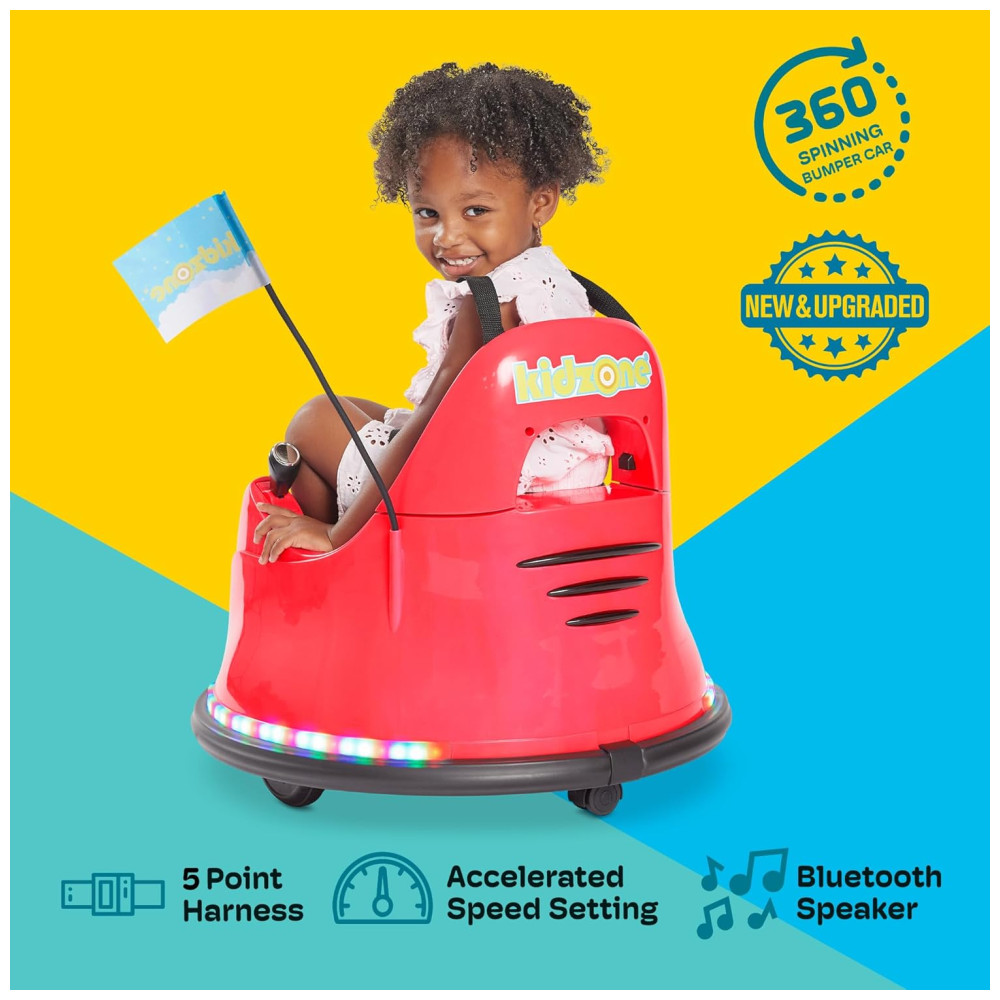 O pára choque elétrico é feito de plástico durável e não tóxico, com cintos de segurança ajustáveis de 5 pontos, pneus anti flat e uma borracha acolchoada na parte inferior para reduzir solavancos. O recurso de segurança de partida lenta garante que cada viagem seja suave e facilmente controlada. O carrinho está em conformidade com os regulamentos de segurança ASTMCPSIACPSCCA Prop 65FCC e vem com uma bandeira de corrida para maior visibilidade.