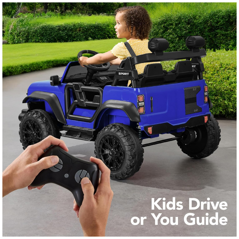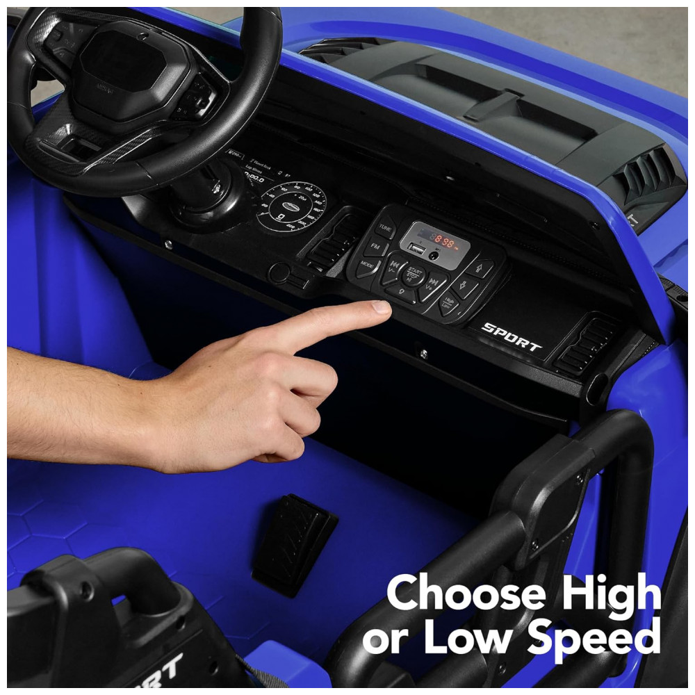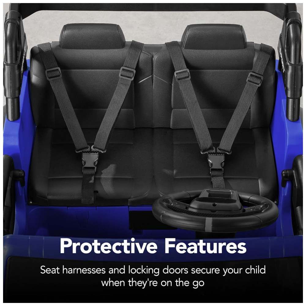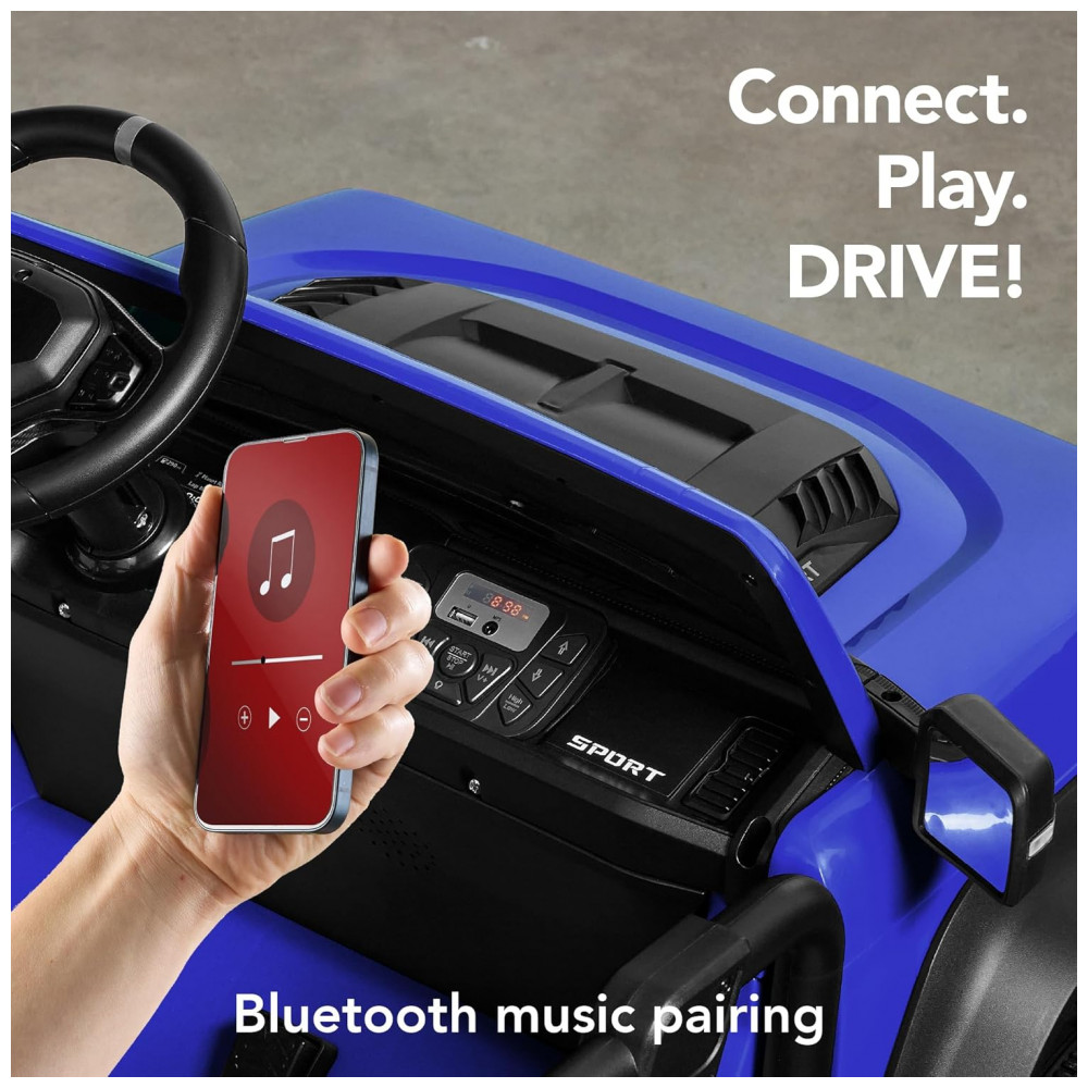 O carro possui sistema de cinto de segurança ajustável para crianças, rodas de plástico com sulcos que proporcionam ótima aderência e suspensão nas duas rodas para um passeio suave. As luzes LED funcionais aumentam a interação, enquanto o sistema de som Bluetooth permite que as crianças ouçam suas músicas favoritas enquanto se divertem.
